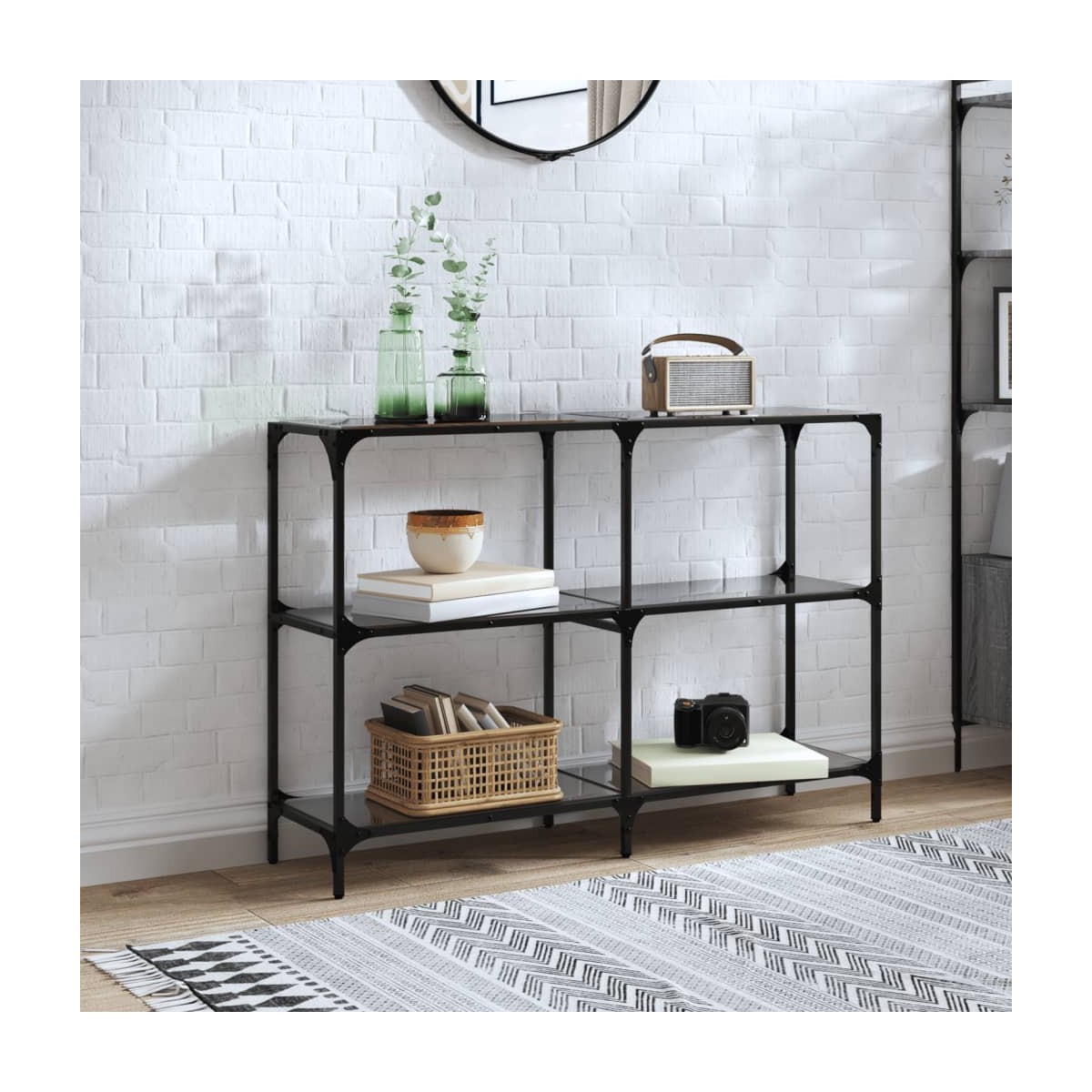 Funcional y bonita, esta mesa consola se convertirá en el centro de atención de tla estancia. Tapa de cristal: La tapa de la mesa de centro proporciona una superficie amplia y visible para colocar jarrones, plantas en macetas u otros elementos decorativos.Estructura robusta y estable: La estructura de acero inoxidable de la mesa del salón garantiza robustez y estabilidad.Fácil mantenimiento: Esta mesa de pasillo con superficie resistente a las manchas es fácil de limpiar y podrás mantener la mesa en su mejor aspecto sin esfuerzo.Diseño moderno: La mesa de pasillo tiene un diseño sencillo y moderno que complementa la decoración de cualquier habitación. Advertencia:Para evitar que vuelque, este producto debe usarse con el dispositivo de fijación a la pared suministrado.