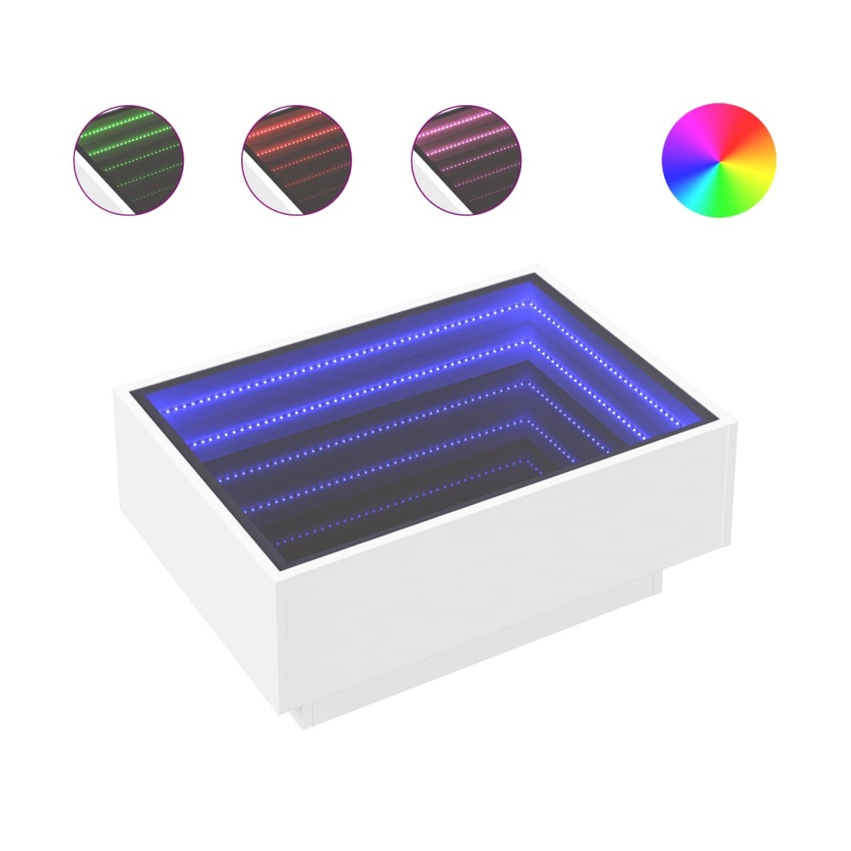 La exclusiva mesa de centro con un espejo infinito LED es adecuada para diferentes lugares. Es una mesa imprescindible para tu casa. Material estable y duradero: La madera de ingeniería es un material duradero y estable con una superficie lisa que es resistente a la humedad, la deformación y la rotura, lo que la convierte en una opción fiable para una variedad de proyectos.Luces LED RGB para un ambiente agradable: Esta mesa de centro cuenta con luces LED que pueden ajustarse fácilmente para crear un espectáculo de luces personalizado, mejorando el ambiente de tu espacio interior.Superficie resistente: La robusta superficie de la mesita de salón es perfecta para colocar bebidas, comida y otros objetos decorativos.Diversos usos: Esta mesa de centro sirve para múltiples propósitos. Puede funcionar como mesa auxiliar o mesa de sofá en tu salón o dormitorio, atendiendo a tus necesidades específicas. Información útil:El producto tiene un conector USB que necesita una fuente de alimentación USB certificada de 5 V (no incluida).