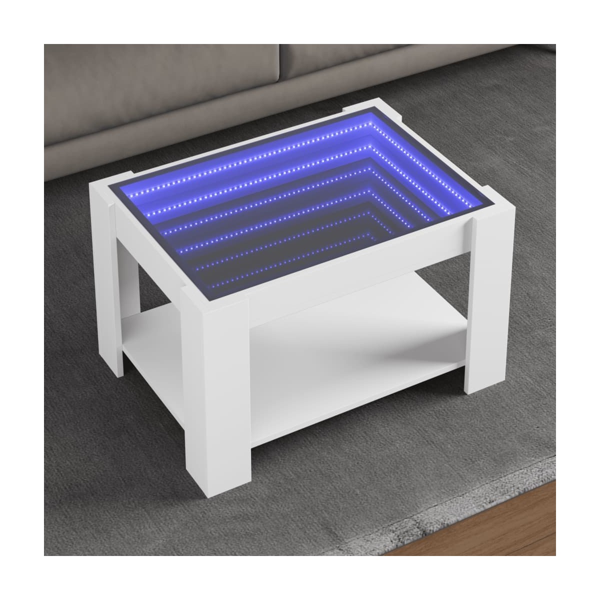 La exclusiva mesa de centro con un espejo infinito LED es adecuada para diferentes lugares. Es una mesa imprescindible para tu casa. Material estable y duradero: La madera de ingeniería es un material duradero y estable con una superficie lisa que es resistente a la humedad, la deformación y la rotura, lo que la convierte en una opción fiable para una variedad de proyectos.Luces LED RGB para un ambiente agradable: Esta mesa de centro cuenta con luces LED que pueden ajustarse fácilmente para crear un espectáculo de luces personalizado, mejorando el ambiente de tu espacio interior.Superficie resistente: La robusta superficie de la mesita de salón es perfecta para colocar bebidas, comida y otros objetos decorativos.Diversos usos: Esta mesa de centro sirve para múltiples propósitos. Puede funcionar como mesa auxiliar o mesa de sofá en tu salón o dormitorio, atendiendo a tus necesidades específicas. Información útil:El producto tiene un conector USB que necesita una fuente de alimentación USB certificada de 5 V (no incluida).