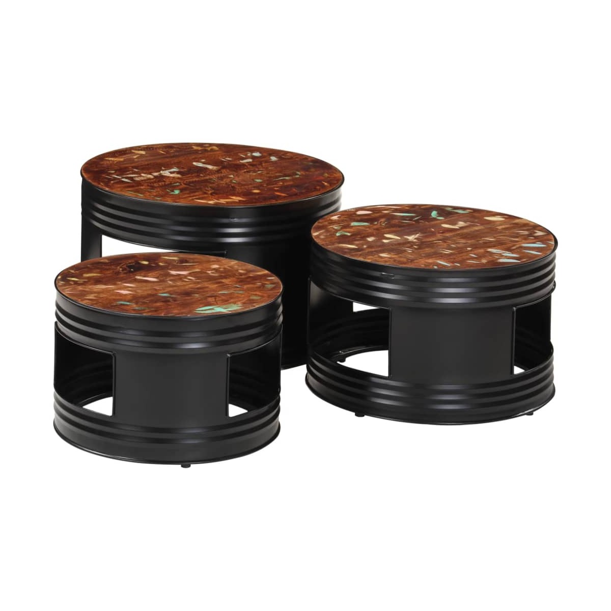Estas mesas de bar de exterior combinan un diseño clásico con un aspecto práctico y sencillo, lo que las convierte en un complemento valioso y elegante para tu hogar. Material duradero: La madera maciza reciclada se compone de maderas reutilizadas como la teca, la madera de mango, de pino y haya. Dichos materiales proceden de antiguas construcciones como fábricas, cobertizos y barcos. Como cada pieza está hecha a mano, los colores variarán en cada producto.Diseño apilable: Gracias a la diferencia de tamaño, estas mesas de centro anidadas no solo pueden satisfacer tus múltiples necesidades, sino que también brindan espacio adicional y fácil almacenamiento cuando las mesas más pequeñas están ocultas debajo de las más grandes.Tablero estable: El tablero resistente de la mesa auxiliar anidada es ideal para dejar tus bebidas o cualquier otra necesidad que necesites al alcance de la mano.Función versátil: ¡Estas mesitas apilables son versátiles! Cualquiera de ellas se puede usar como mesita de noche en el dormitorio, mesa auxiliar o mesa de sofá en la sala de estar y la oficina. Información útil:Cada artículo es único, con variaciones de color y veta. La entrega es aleatoria garantizando la exclusividad y la individualidad del producto.