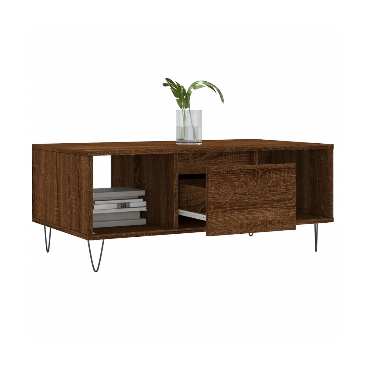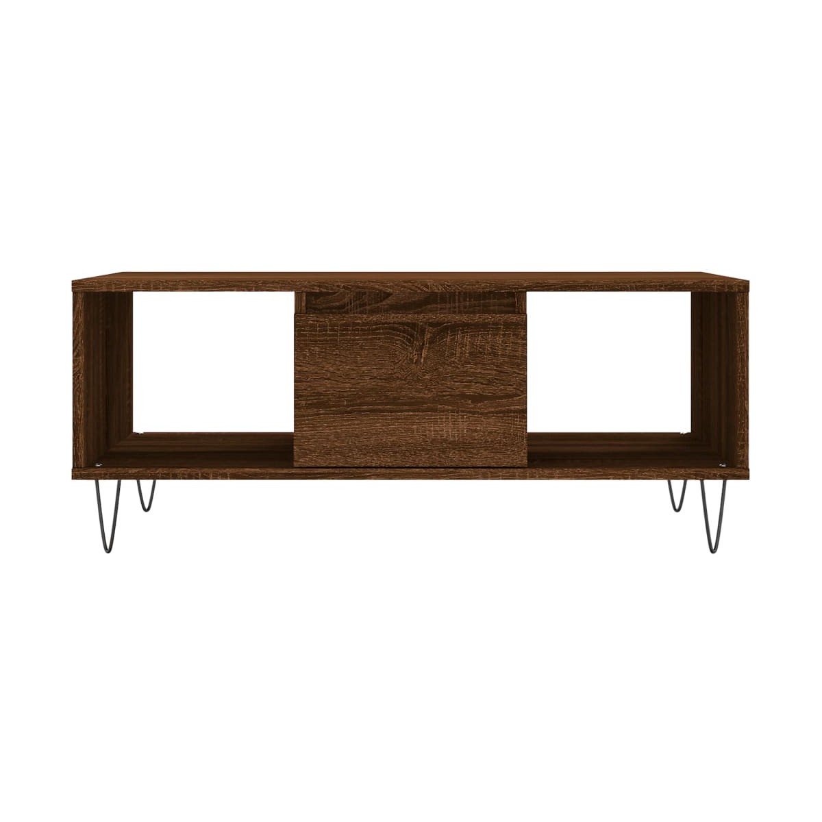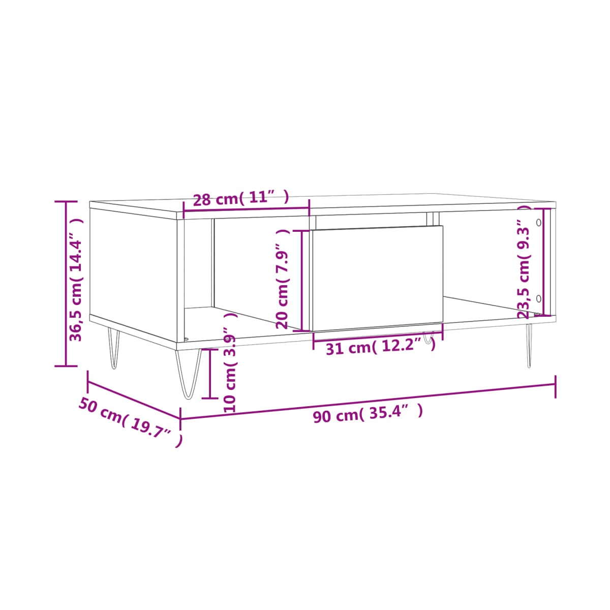 Dale un toque de elegancia a la casa con esta estilosa mesa de centro. Material duradero: La madera contrachapada tiene una calidad excepcional, con una superficie lisa y también cuenta con fuerza, estabilidad y resistencia a la humedad. Hecha de madera tecnológica, la mesa auxiliar es fácil de limpiar con un paño húmedo.Amplio espacio de almacenaje: Esta mesita de sofá tiene un cajón y 2 compartimentos, por lo que ofrece un amplio espacio de almacenamiento para mantener tus cosas bien organizadas y al alcance.Superficie resistente: La robusta superficie es perfecta para colocar bebidas, comida y artículos decorativos.Patas de metal: Las patas de metal le dan un estilo moderno y tranquilo a la casa mientras garantizan su estabilidad.