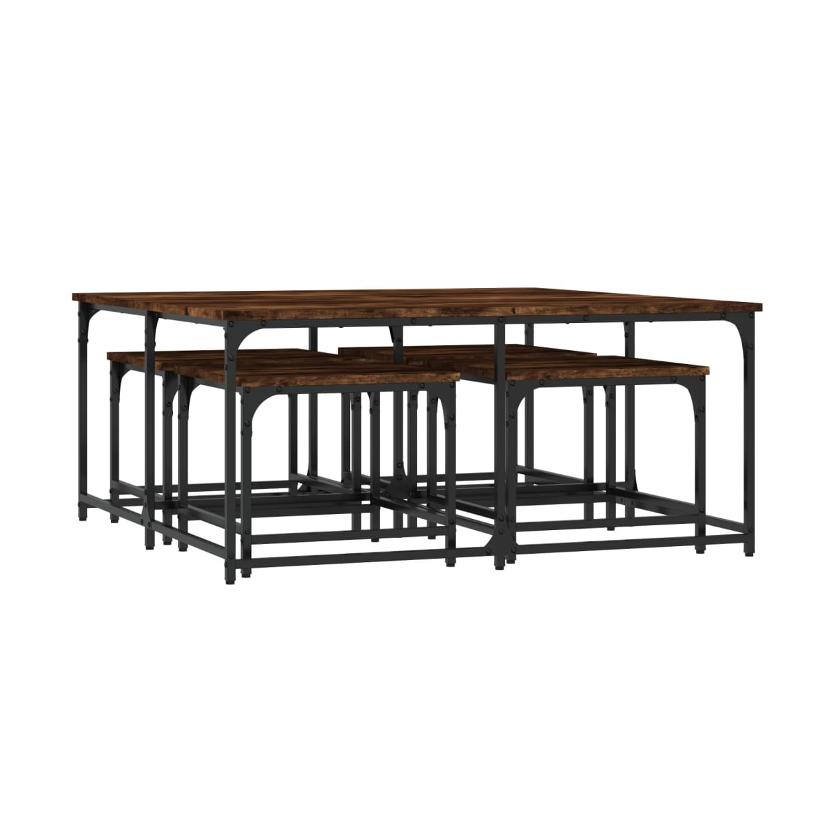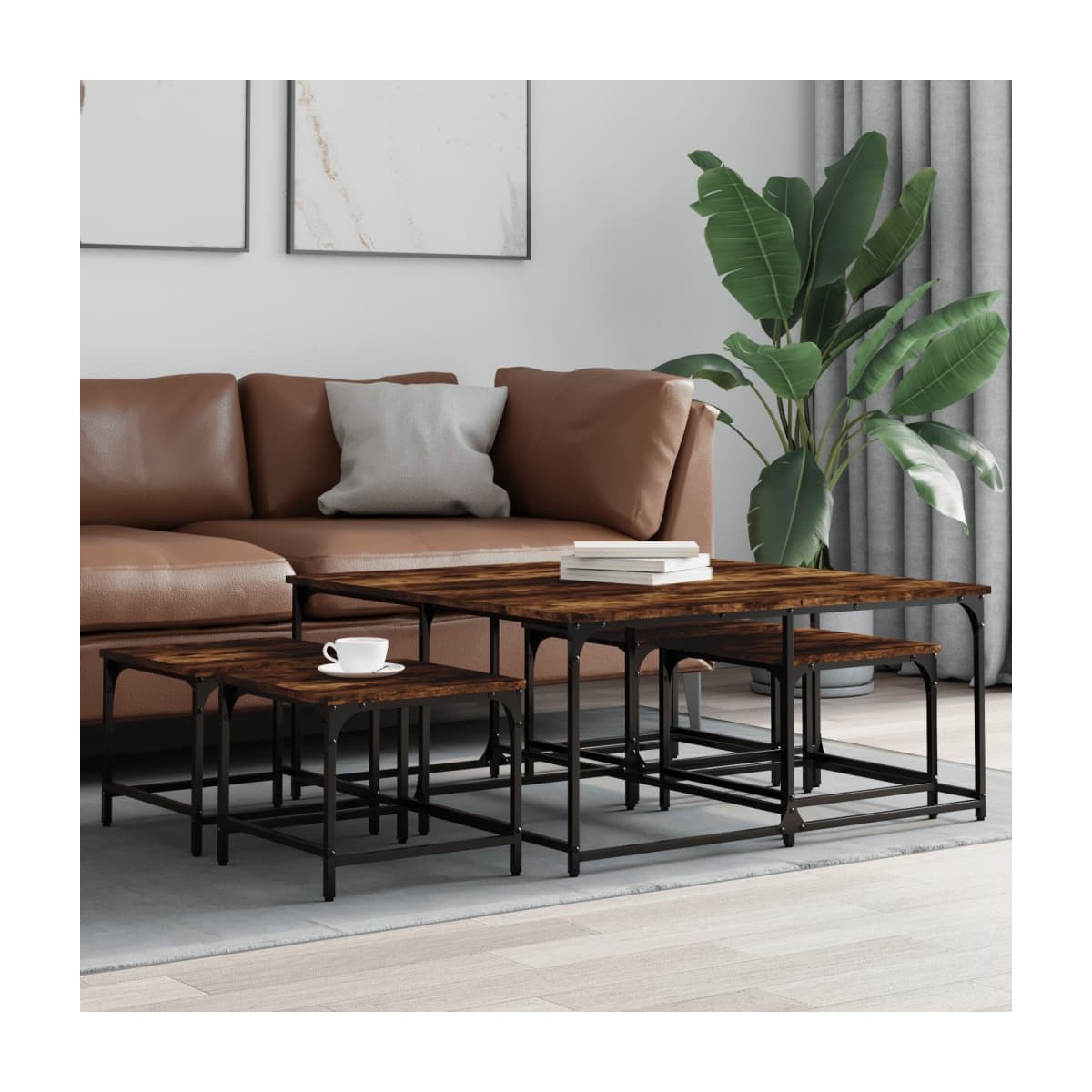 Las 5 mesas de centro apilables son la alternativa perfecta para pisos pequeños o cualquier zona con espacio limitado. Su diseño industrial convierte a este juego de mesas de centro en un aporte elegante para el salón, el dormitorio o la oficina. Material duradero: Las mesas apilables están hechas de madera de ingeniería, con una calidad excepcional y superficie lisa, además de ser fuerte, estable y resistente a la humedad.Diseño apilable: Las mesitas apilables tienen diferentes tamaños para distintos propósitos. Si necesitas más espacio, las mesas más pequeñas caben dentro de la mesa de centro más grande. Asimismo, puedes separarlas para ampliar la superficie.Función versátil: Las mesas auxiliares apilables son versátiles. Cualquiera de ellas se puede usar como mesita de noche en el dormitorio, mesa auxiliar o mesita de sofá en el salón y la oficina.Superficie resistente: La resistente superficie de las mesas apilables es ideal para dejar las bebidas o cualquier otra cosa que necesites tener al alcance de la mano.