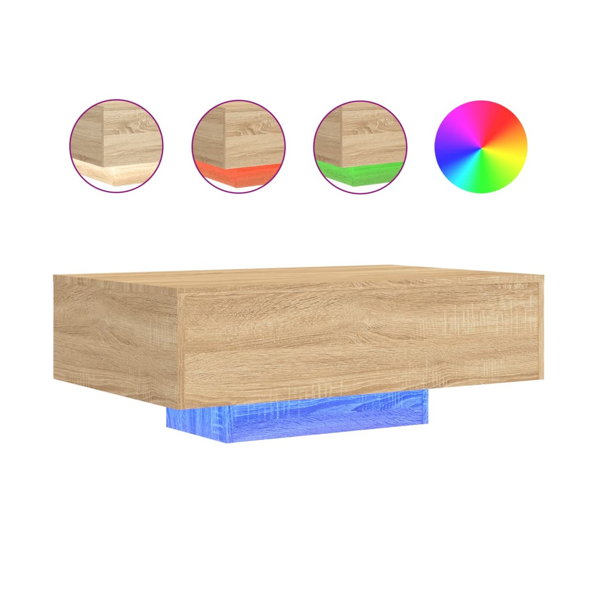 Decora el salón con esta moderna mesa de centro con luces LED, que combina fácilmente con muebles de cualquier estilo. Material duradero: La madera de ingeniería tiene una calidad excepcional, con una superficie lisa y también cuenta con fuerza, estabilidad y resistencia a la humedad.Superficie robusta: La superficie resistente de esta mesa auxiliar proporciona una superficie segura para colocar bebidas, jarrones, fruteros o adornos.Diseño versátil: Esta mesa de sofá puede satisfacer diferentes necesidades, ya que se puede usar como mesa auxiliar, mesita o mesita de teléfono.Luces LED ajustables: La mesita de sofá está equipada con vibrantes luces LED RGB. Con diversos menús personalizables, puedes cambiar el color de las luces sin problemas e incluso hacer que se regulen automáticamente. Estas luces LED no sólo realzan el aspecto moderno de la mesita de centro, sino que también le dan un toque de moda. Información útil:El producto tiene un conector USB que necesita una fuente de alimentación USB certificada de 5 V (no incluida).
