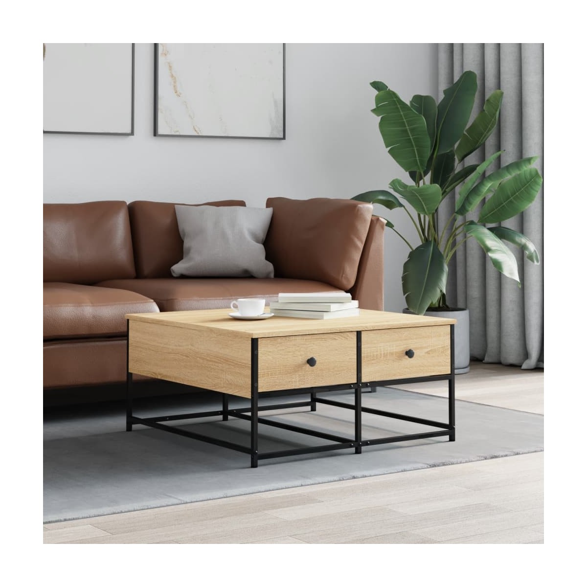 Dale un toque de elegancia a la casa con esta estilosa mesa de centro. Material duradero: La mesa auxiliar está hecha de madera de ingeniería. La madera de ingeniería tiene una calidad excepcional, con una superficie lisa, y también es fuerte, estable y resistente a la humedad.Amplio espacio de almacenaje: Esta mesa de sofá con 2 cajones ofrece un amplio espacio de almacenaje para mantener tus cosas bien organizadas y al alcance de la mano.Superficie estable: La estable superficie de la mesita de salón es perfecta para colocar bebidas, comida y objetos decorativos.Estructura robusta: La estructura de metal de esta mesa de sofá garantiza su solidez y estabilidad.