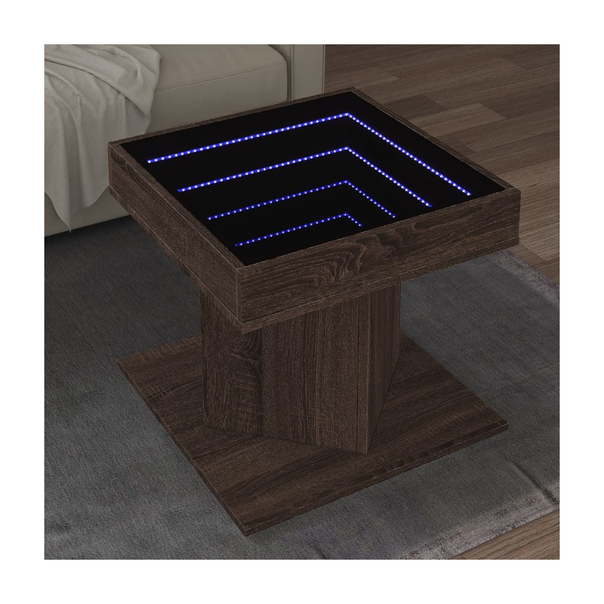 La exclusiva mesa de centro con un espejo infinito LED es adecuada para diferentes lugares. Es una mesa imprescindible para tu casa. Material estable y duradero: La madera de ingeniería es un material duradero y estable con una superficie lisa que es resistente a la humedad, la deformación y la rotura, lo que la convierte en una opción fiable para una variedad de proyectos.Luces LED RGB para un ambiente agradable: Esta mesa de centro cuenta con luces LED que pueden ajustarse fácilmente para crear un espectáculo de luces personalizado, mejorando el ambiente de tu espacio interior.Superficie resistente: La robusta superficie de la mesita de salón es perfecta para colocar bebidas, comida y otros objetos decorativos.Diversos usos: Esta mesa de centro sirve para múltiples propósitos. Puede funcionar como mesa auxiliar o mesa de sofá en tu salón o dormitorio, atendiendo a tus necesidades específicas. Información útil:El producto tiene un conector USB que necesita una fuente de alimentación USB certificada de 5 V (no incluida).