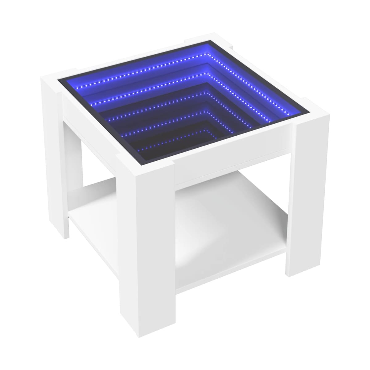 La exclusiva mesa de centro con un espejo infinito LED es adecuada para diferentes lugares. Es una mesa imprescindible para tu casa. Material estable y duradero: La madera de ingeniería es un material duradero y estable con una superficie lisa que es resistente a la humedad, la deformación y la rotura, lo que la convierte en una opción fiable para una variedad de proyectos.Luces LED RGB para un ambiente agradable: Esta mesa de centro cuenta con luces LED que pueden ajustarse fácilmente para crear un espectáculo de luces personalizado, mejorando el ambiente de tu espacio interior.Superficie resistente: La robusta superficie de la mesita de salón es perfecta para colocar bebidas, comida y otros objetos decorativos.Diversos usos: Esta mesa de centro sirve para múltiples propósitos. Puede funcionar como mesa auxiliar o mesa de sofá en tu salón o dormitorio, atendiendo a tus necesidades específicas. Información útil:El producto tiene un conector USB que necesita una fuente de alimentación USB certificada de 5 V (no incluida).