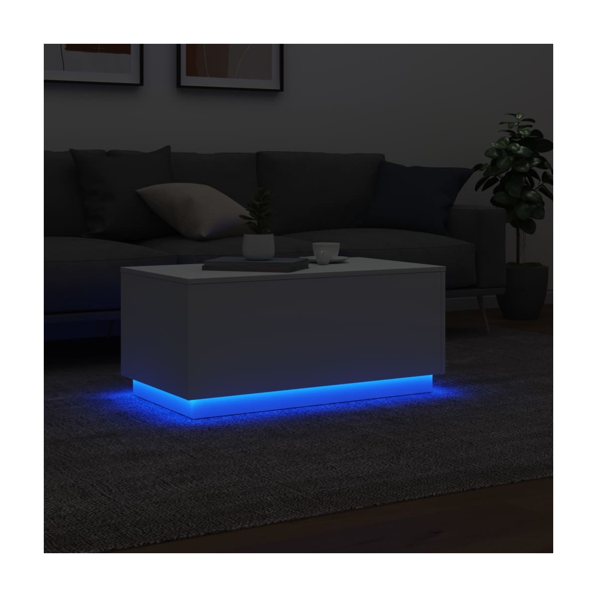 Decora el salón con esta moderna mesa de centro con luces LED, que combina fácilmente con muebles de cualquier estilo. Material duradero: La madera de ingeniería tiene una calidad excepcional, con una superficie lisa y también cuenta con fuerza, estabilidad y resistencia a la humedad.Superficie robusta: La superficie resistente de esta mesa auxiliar proporciona una superficie segura para colocar bebidas, jarrones, fruteros o adornos.Luces LED RGB: La mesita de sofá está equipada con vibrantes luces LED RGB. Con diversos menús personalizables, puedes cambiar el color de las luces sin problemas e incluso hacer que se regulen automáticamente. Estas luces LED no sólo realzan el aspecto moderno de la mesita de centro, sino que también le dan un toque de moda.Diseño versátil: Esta mesa de sofá puede satisfacer diferentes necesidades, ya que se puede usar como mesa auxiliar, mesita o mesita de teléfono. Información útil:El producto tiene un conector USB que necesita una fuente de alimentación USB certificada de 5 V (no incluida).