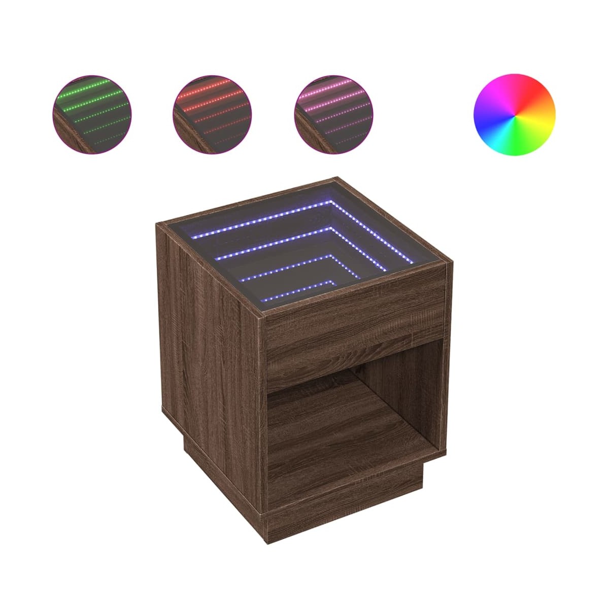 La exclusiva mesa de centro con espejo LED Infinity es adecuada para diferentes lugares. Material estable y duradero: La madera de ingeniería es un material duradero y estable con una superficie lisa que es resistente a la humedad, la deformación y la rotura, lo que la convierte en una opción fiable para una variedad de proyectos.Luces LED RGB para un ambiente agradable: Esta mesa cuenta con luces LED que se pueden ajustar fácilmente para crear un espectáculo de luces personalizado. Puedes personalizar los modos, los colores y el brillo para mejorar el ambiente de tu espacio de interior.Superficie resistente: La robusta superficie de la mesita de salón es perfecta para colocar bebidas, comida y otros objetos decorativos.Diversos usos: Esta mesa de centro sirve para múltiples propósitos. Puede funcionar como mesa auxiliar o mesa de sofá en tu salón o dormitorio, atendiendo a tus necesidades específicas. Información útil:El producto tiene un conector USB que necesita una fuente de alimentación USB certificada de 5 V (no incluida).