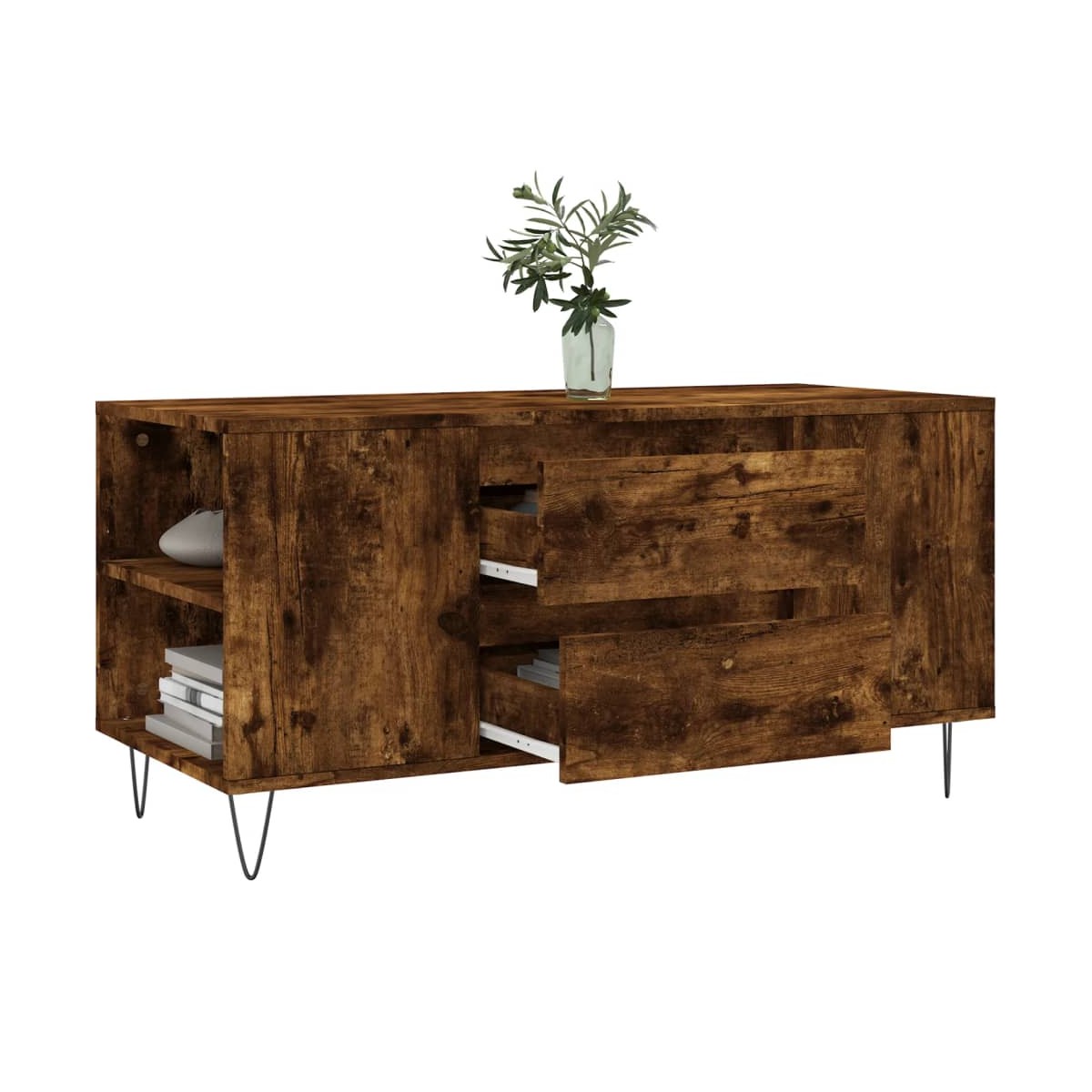 Dale un toque de elegancia a la casa con esta estilosa mesa de centro. Material duradero: La madera contrachapada tiene una calidad excepcional, con una superficie lisa y también cuenta con fuerza, estabilidad y resistencia a la humedad. Hecha de madera tecnológica, la mesa auxiliar es fácil de limpiar con un paño húmedo.Amplio espacio de almacenaje: La mesa de sofá tiene 2 cajones y 4 compartimentos, por lo que ofrece un amplio espacio de almacenaje para guardar tus cosas bien organizadas y al alcance.Superficie resistente: La robusta superficie es perfecta para colocar bebidas, comida y artículos decorativos.Patas de metal: Las patas de metal le dan un estilo moderno y tranquilo a la casa mientras garantizan su estabilidad. Advertencia:Para evitar que vuelque, este producto debe usarse con el dispositivo de fijación a la pared incluido.