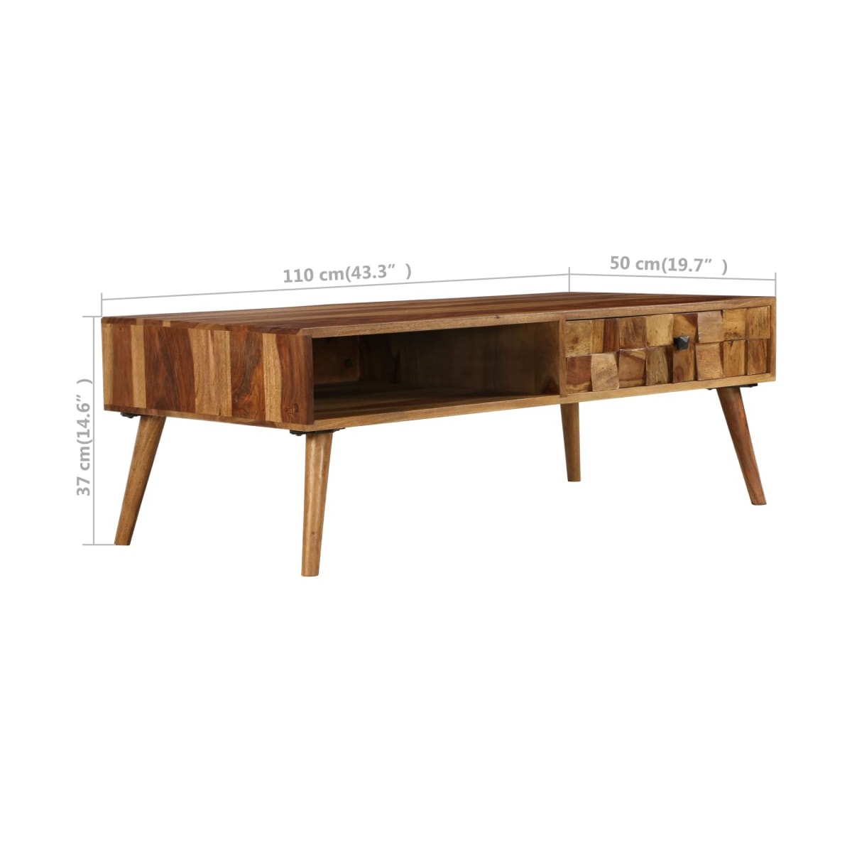 Nuestra mesa maciza de café sheesham con acabado de miel emana un encanto vintage y será un aporte distintivo para su casa con su diseño llamativo. Esta mesa está hecha de madera maciza de sheesham y también se puede utilizar como mesa auxiliar o mesita de sofá. Sheesham es una madera dura tropical que es famosa por sus ricas vetas y también es llamada palo de rosa o palisandro. Cada paso del proceso se lleva a cabo con el mayor cuidado, tanto sea pulido como la pintura o lacado. La artesanía y las bonitas vetas de la madera hacen que cada pieza de mobiliario sea única y ligeramente diferente del resto. Diseñada con 1 compartimiento de almacenamiento y 1 cajón, esta mesa tiene un amplio espacio para libros, revistas u otros artículos pequeños que quiera tener al alcance. Sus patas de madera también contribuyen a su robustez, así como a su moderno diseño de mediados de siglo. Su montaje es facil. Nota importante: Las vetas de la madera y los colores pueden variar de una pieza a otra, lo que hace que cada una de nuestras mesas sea única; la entrega es aleatoria
