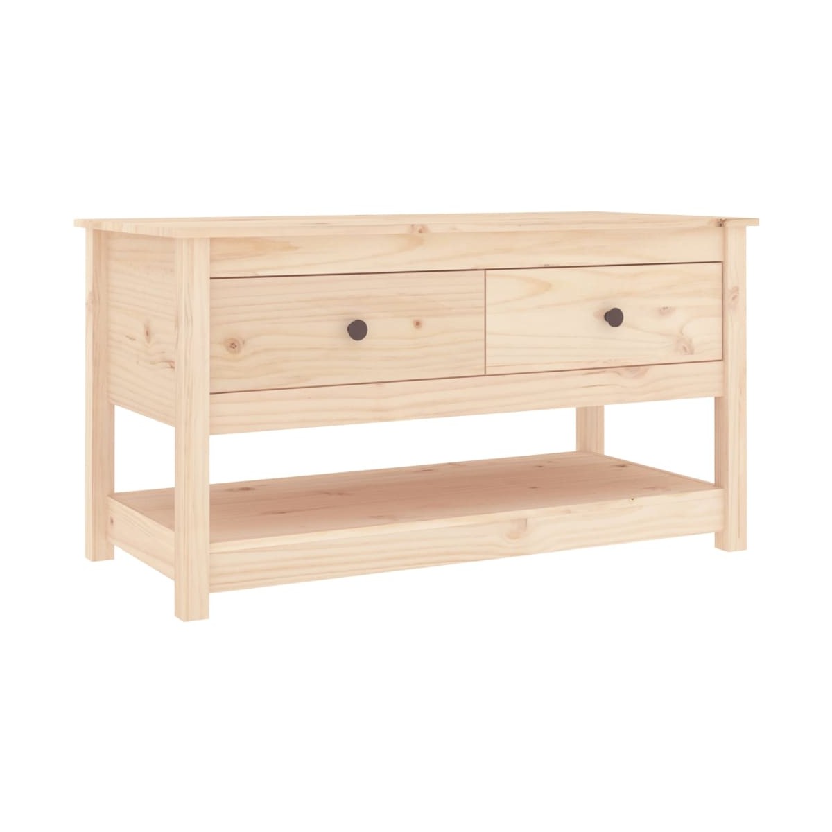 Esta elegante mesa de centro de madera es un aporte decorativo y práctico perfecto para la casa. Madera de pino maciza: La madera de pino maciza es un bonito material natural. La madera de pino tiene vetas rectas, y los nudos dan al material su distintivo aspecto rústico.Amplio espacio de almacenaje: La mesa auxiliar tiene 1 estante abierto y 2 cajones, que proporcionan amplio espacio de almacenaje para guardar bien organizados tus artículos básicos del día a día.Superficie resistente: La superficie de esta mesita de sofá proporciona una zona estable y segura para colocar bebidas, comida y otros elementos esenciales. Nota:Cada producto viene con un manual de montaje en la caja para facilitar el montaje.Advertencia:Para evitar el vuelco, este producto debe usarse con el dispositivo provisto para fijarlo a la pared.