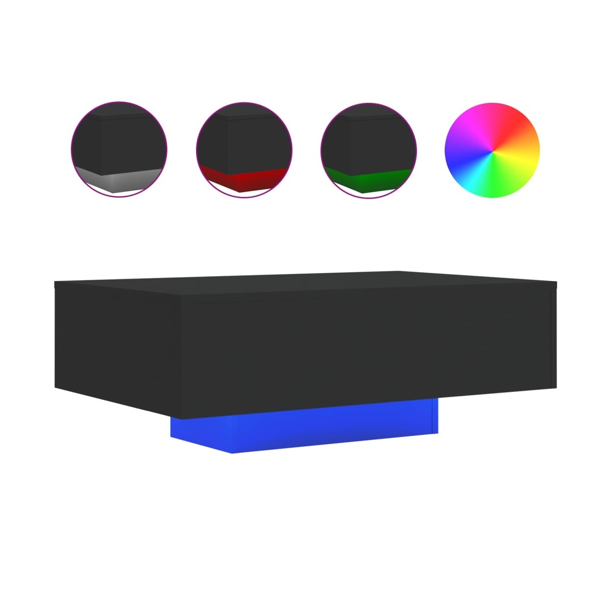 Decora el salón con esta moderna mesa de centro con luces LED, que combina fácilmente con muebles de cualquier estilo. Material duradero: La madera de ingeniería tiene una calidad excepcional, con una superficie lisa y también cuenta con fuerza, estabilidad y resistencia a la humedad.Superficie robusta: La superficie resistente de esta mesa auxiliar proporciona una superficie segura para colocar bebidas, jarrones, fruteros o adornos.Diseño versátil: Esta mesa de sofá puede satisfacer diferentes necesidades, ya que se puede usar como mesa auxiliar, mesita o mesita de teléfono.Luces LED ajustables: La mesita de sofá está equipada con vibrantes luces LED RGB. Con diversos menús personalizables, puedes cambiar el color de las luces sin problemas e incluso hacer que se regulen automáticamente. Estas luces LED no sólo realzan el aspecto moderno de la mesita de centro, sino que también le dan un toque de moda. Información útil:El producto tiene un conector USB que necesita una fuente de alimentación USB certificada de 5 V (no incluida).