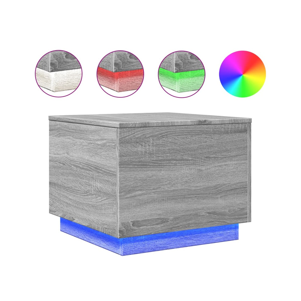 Decora el salón con esta moderna mesa de centro con luces LED, que combina fácilmente con muebles de cualquier estilo. Material duradero: La madera de ingeniería tiene una calidad excepcional, con una superficie lisa y también cuenta con fuerza, estabilidad y resistencia a la humedad.Superficie robusta: La superficie resistente de esta mesa auxiliar proporciona una superficie segura para colocar bebidas, jarrones, fruteros o adornos.Luces LED RGB: La mesita de sofá está equipada con vibrantes luces LED RGB. Con diversos menús personalizables, puedes cambiar el color de las luces sin problemas e incluso hacer que se regulen automáticamente. Estas luces LED no sólo realzan el aspecto moderno de la mesita de centro, sino que también le dan un toque de moda.Diseño versátil: Esta mesa de sofá puede satisfacer diferentes necesidades, ya que se puede usar como mesa auxiliar, mesita o mesita de teléfono. Información útil:El producto tiene un conector USB que necesita una fuente de alimentación USB certificada de 5 V (no incluida).