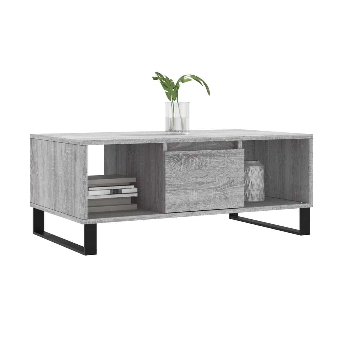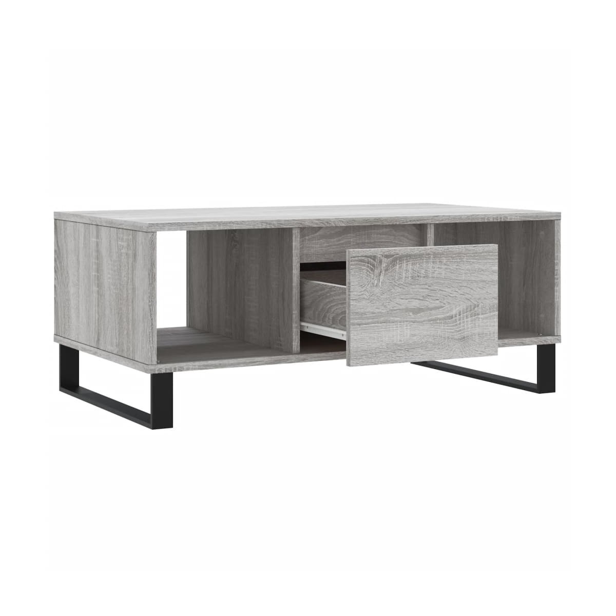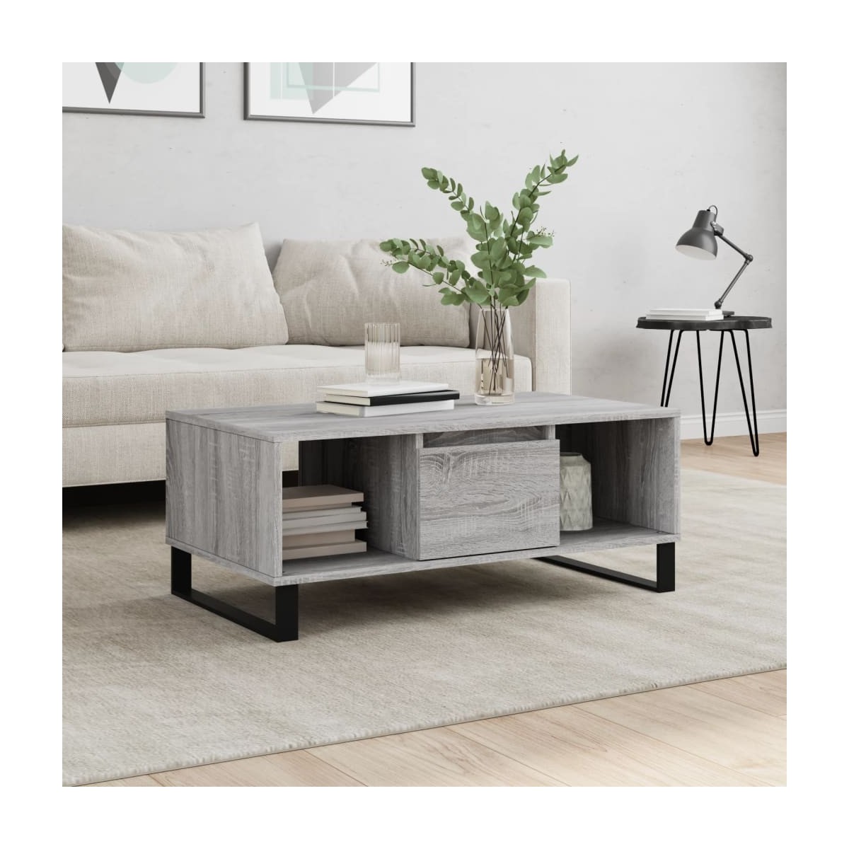 Dale un toque de elegancia a la casa con esta estilosa mesa de centro. Material duradero: La madera contrachapada tiene una calidad excepcional, con una superficie lisa y también cuenta con fuerza, estabilidad y resistencia a la humedad. Hecha de madera tecnológica, la mesa auxiliar es fácil de limpiar con un paño húmedo.Amplio espacio de almacenaje: Esta mesita de sofá tiene un cajón y 2 compartimentos, por lo que ofrece un amplio espacio de almacenamiento para mantener tus cosas bien organizadas y al alcance.Superficie resistente: La robusta superficie es perfecta para colocar bebidas, comida y artículos decorativos.Patas de metal: Las patas de metal le dan un estilo moderno y tranquilo a la casa mientras garantizan su estabilidad.