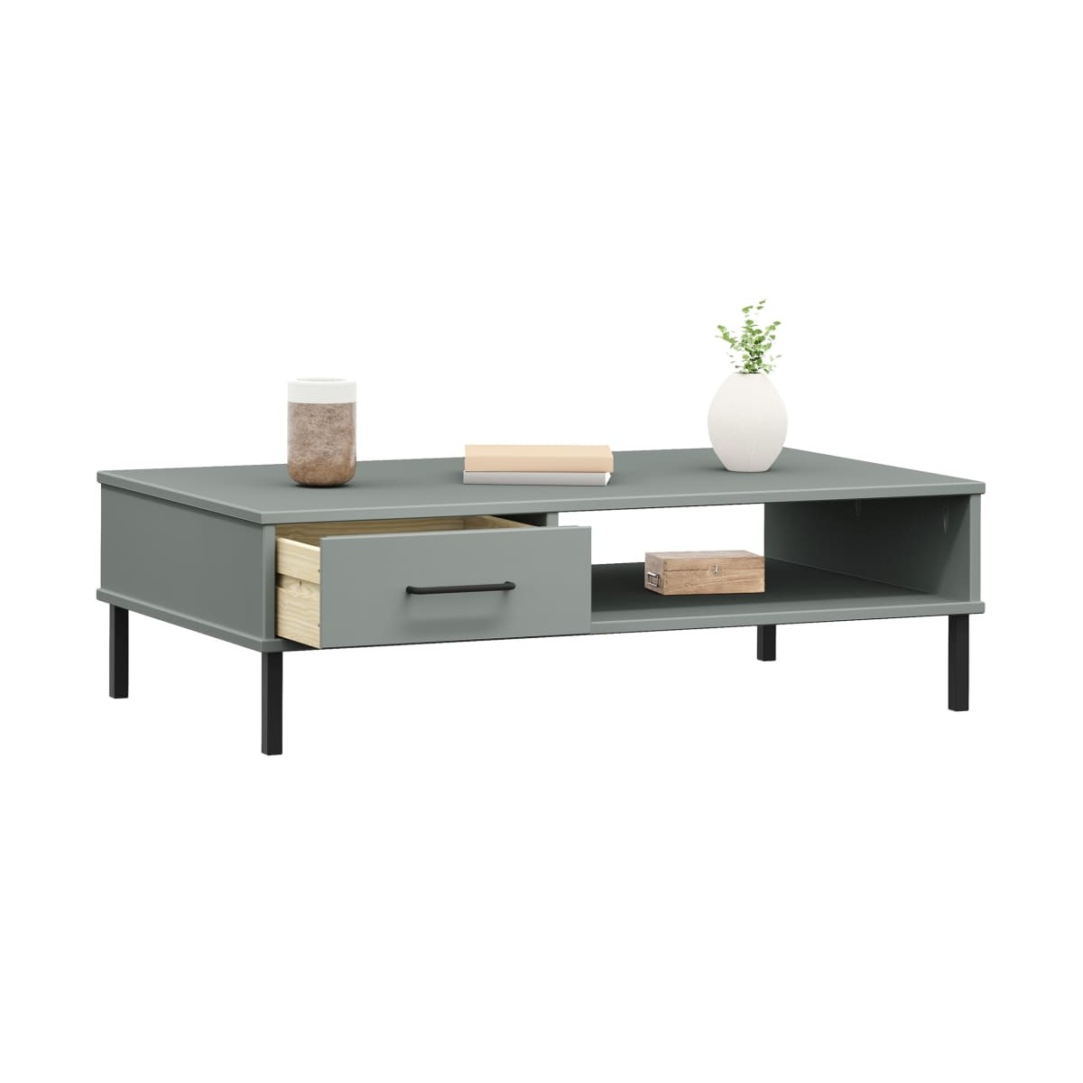 ¿Estás buscando una mesa de centro para tu tiempo libre? No busques más que esta mesa de centro de madera, que da una experiencia visual única a la zona. Material duradero: La mesita auxiliar está hecha de madera maciza de pino, que es un bonito material natural. La madera de pino tiene vetas rectas, y los nudos dan al material su distintivo aspecto rústico.Almacenaje espacioso: Esta mesa de sofá cuenta con 1 compartimento abierto y 1 cajón, por lo que ofrece un amplio espacio de almacenaje para mantener organizados tus artículos del día a día.Superficie resistente: La parte superior de la mesita de salón proporciona una superficie segura para colocar aperitivos, bebidas, jarrones, fruteros u otros artículos decorativos.Patas metálicas: Las patas de metal de esta mesa de centro garantizan la robustez y la estabilidad. Nota:Cada producto viene con un manual de montaje en la caja para facilitar el montaje.