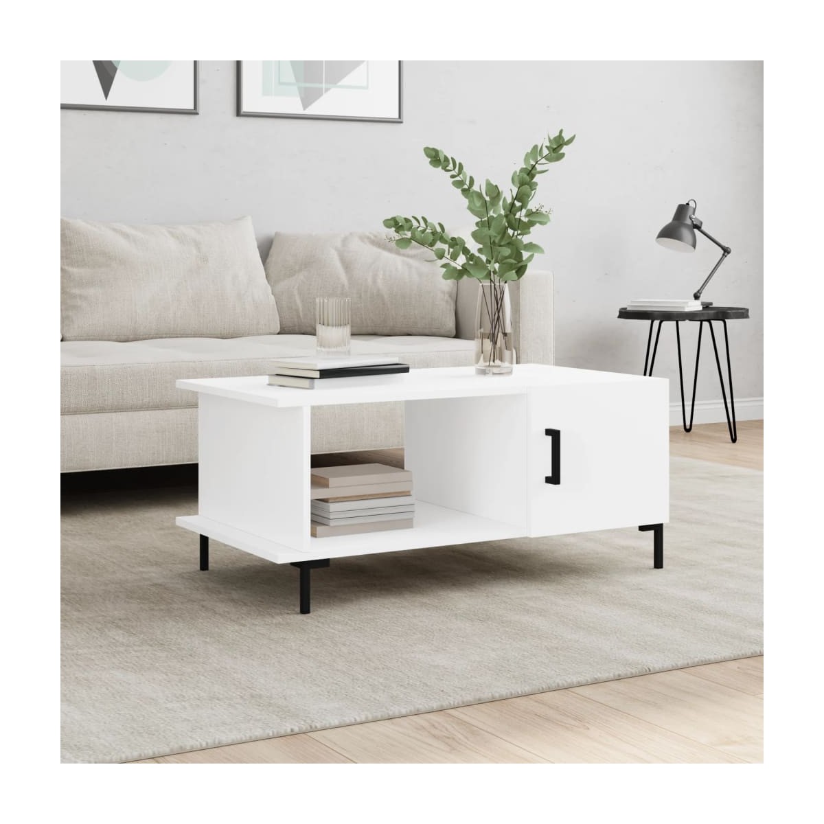 Dale un toque de elegancia a la casa con esta estilosa mesa de centro. Material duradero: La madera contrachapada tiene una calidad excepcional, con una superficie lisa y también cuenta con fuerza, estabilidad y resistencia a la humedad.Amplio espacio de almacenaje: Esta mesita auxiliar tiene 2 compartimentos, por lo que ofrece un amplio espacio de almacenamiento para mantener tus cosas del día a día bien organizadas y al alcance.Superficie robusta: La robusta superficie de la mesita de sofá es perfecta para colocar bebidas, comida y otros objetos decorativos.Puerta práctica: Mantén ordenada la casa al esconder pequeños objetos esenciales detrás de la puerta de la mesita de salón.Patas de hierro: Las patas de hierro dan un estilo tranquilo a la casa, además de garantizar la estabilidad de la mesa.