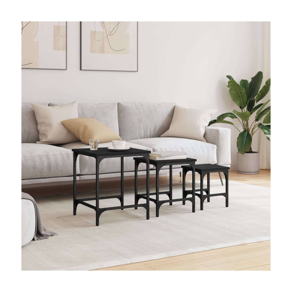 Estas tres mesas de centro apilables son una solución inteligente para salones pequeños o cualquier zona con poco espacio. Con un diseño industrial, este conjunto de mesas de centro añade un toque elegante a tu salón, dormitorio u oficina. Material duradero: La madera contrachapada tiene una calidad excepcional, con una superficie lisa y también cuenta con fuerza, estabilidad y resistencia a la humedad. Hechas de madera contrachapada, las mesas apilables son fáciles de limpiar.Diseño apilable: Las mesitas apilables tienen diferentes tamaños para satisfacer diferentes necesidades. La mesa más pequeña cabe dentro de la más grande si necesitas más espacio.Superficie resistente: La resistente superficie de las mesas apilables es ideal para dejar las bebidas o cualquier otra cosa que necesites tener al alcance de la mano.Función versátil: Las mesas auxiliares apilables son versátiles. Cualquiera de ellas se puede usar como mesita de noche en el dormitorio, mesa auxiliar o mesita de sofá en el salón y la oficina.Estructura metálica: La estructura metálica añade un estilo industrial a la casa, además de garantizar su durabilidad y estabilidad. Advertencia:Para evitar que vuelque, este producto debe usarse con el dispositivo de fijación a la pared incluido.