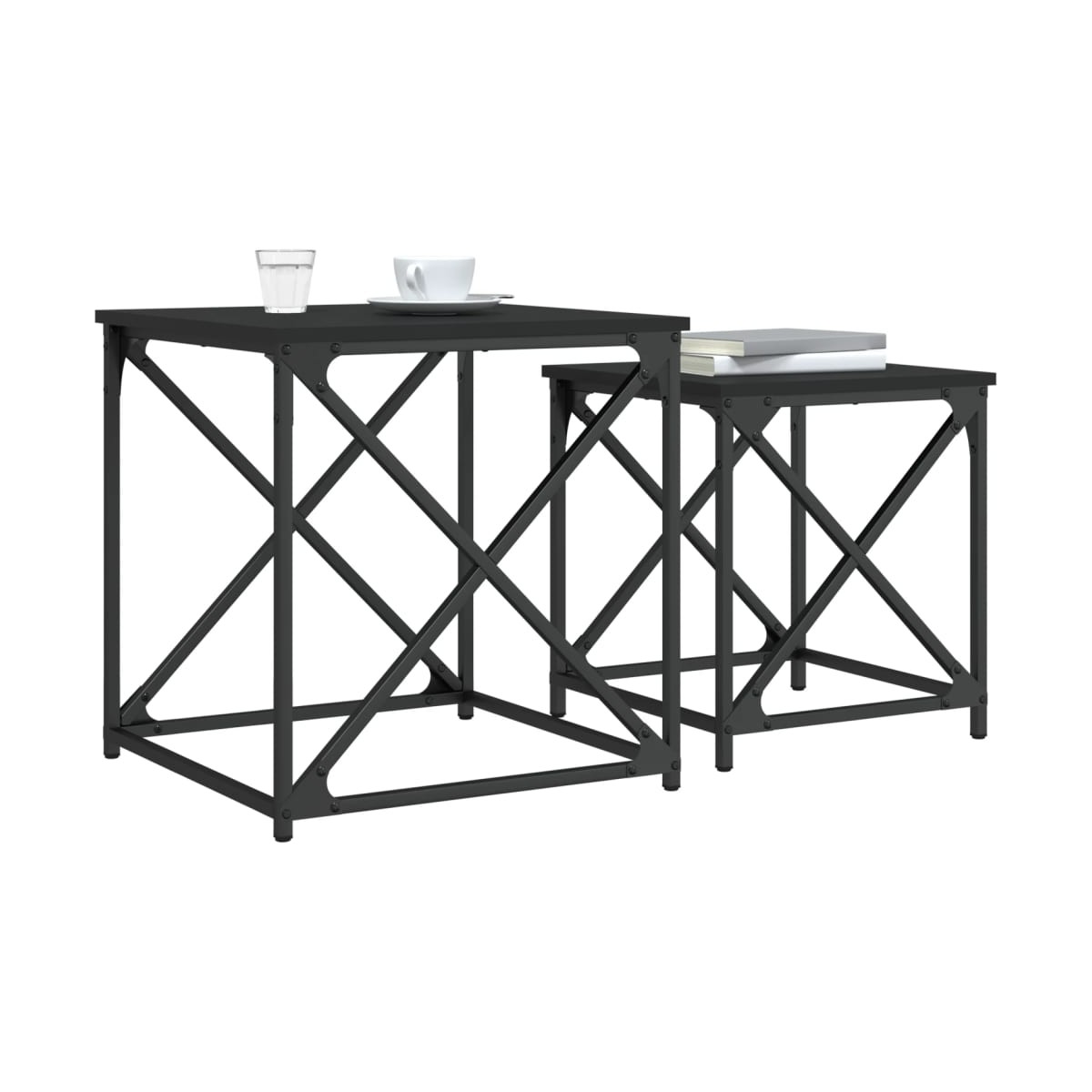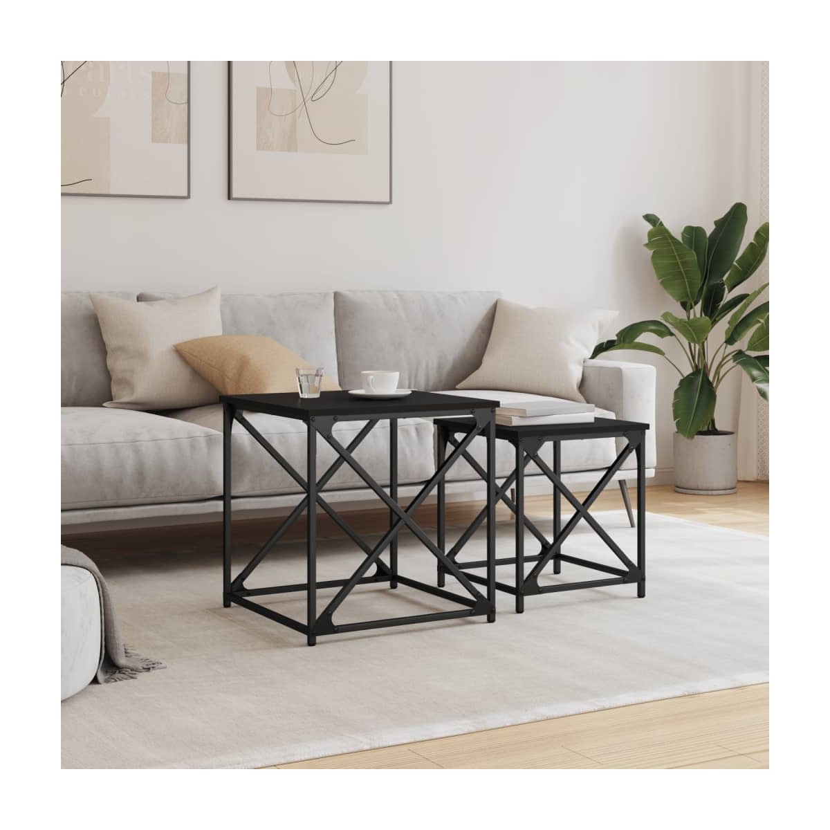 Estas dos mesas de centro apilables son una solución inteligente para salones pequeños o cualquier zona con poco espacio. Con un diseño industrial, este conjunto de mesas de centro añade un toque elegante a tu salón, dormitorio u oficina. Material duradero: La madera de ingeniería tiene una calidad excepcional, con una superficie lisa, y también se caracteriza por su fuerza, estabilidad y resistencia a la humedad. Hecha de madera de ingeniería, la mesita de centro es fácil de limpiar.Diseño apilable: Las mesitas apilables tienen diferentes tamaños para satisfacer diferentes necesidades. La mesa más pequeña cabe dentro de la más grande si necesitas más espacio.Superficie resistente: La resistente superficie de las mesas apilables es ideal para dejar las bebidas o cualquier otra cosa que necesites tener al alcance de la mano.Función versátil: El juego de mesas de centro apilables es muy versátil. Cualquiera de ellas puede utilizarse como mesita de noche en el dormitorio, mesa auxiliar o mesa de sofá en el salón y el despacho.Estructura metálica: La estructura metálica añade un estilo industrial a la casa, además de garantizar su durabilidad y estabilidad. Advertencia:Para evitar que vuelque, este producto debe usarse con el dispositivo de fijación a la pared incluido.
