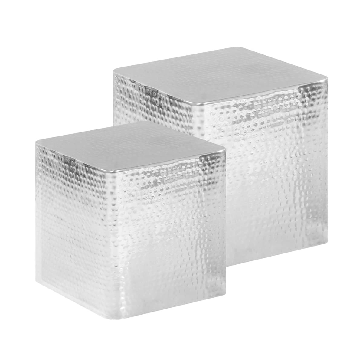 Estas llamativas mesas de centro se convertirán en el centro de atención de su salón u oficina y complementarán una amplia variedad de estilos de mobiliario. Estas mesas auxiliares están hechas de aluminio pulido para mayor estabilidad y robustez. Además, el atractivo acabado martillado agrega textura a la mesa. Tenga en cuenta que los artículos ya están montados. ¡Dele un toque moderno a la decoración de su hogar con nuestro exclusivo juego de mesas de centro! La entrega incluye 2 mesas de centro de diferentes tamaños.