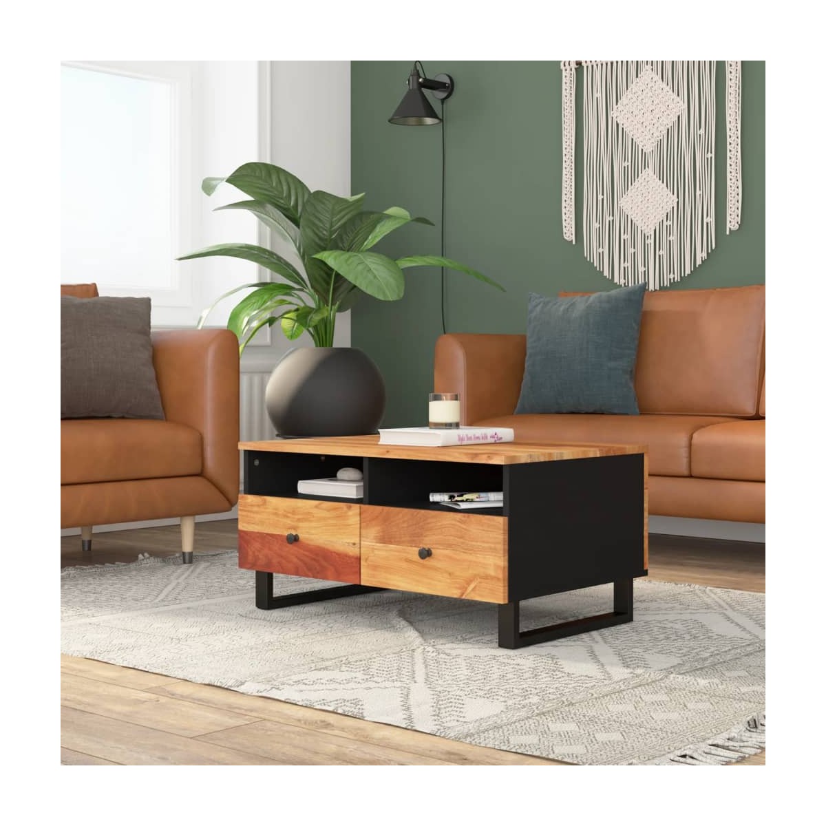 ¿Estás buscando una mesa de centro para tu tiempo libre? Pues no busques más: esta mesa de centro aporta una experiencia visual única a la casa. Madera maciza de acacia: Esta mesa auxiliar está hecha de madera maciza de acacia. Material maciza de acacia: La madera maciza de acacia es un bonito material natural. La madera de acacia es una madera dura tropical, densa, robusta y duradera. Amplio almacenaje: Esta mesita de sofá cuenta con 2 compartimentos abiertos y 2 cajones, lo que brinda un amplio espacio de almacenaje para mantener tus cosas organizadas y al alcance.Superficie resistente: La parte superior de la mesita de salón proporciona una superficie segura para colocar aperitivos, bebidas, jarrones, fruteros u otros artículos decorativos.Patas estables: Las patas de hierro de esta mesa de sofá garantizan su solidez y estabilidad. Información útil:Para facilitar al máximo el montaje, cada producto se entrega con un manual.Los colores y las vetas varían en cada artículo, por lo que cada pieza es única. La entrega es aleatoria, asegurando la exclusividad e individualidad del producto.