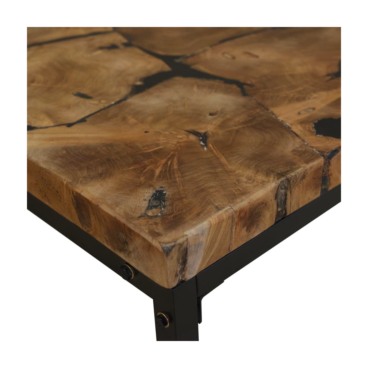 Esta mesa de centro única, hecha de teca real con resina negra, emana un encanto rústico y es un verdadero atractivo. La mesa de centro también se puede usar como mesa auxiliar, mesita de salón, etc. La superficie de la mesa está hecha completamente de teca genuina y proporciona una superficie estable y segura en la que puede colocar sus bebidas, jarrones, fruteros o artículos decorativos. La estructura de acero hace que esta mesa de centro sea muy estable, resistente y duradera. El montaje es fácil. Nota importante: El color puede variar de una pieza a otra, haciendo que cada una de nuestras mesas de centro sea única; la entrega es aleatoria.