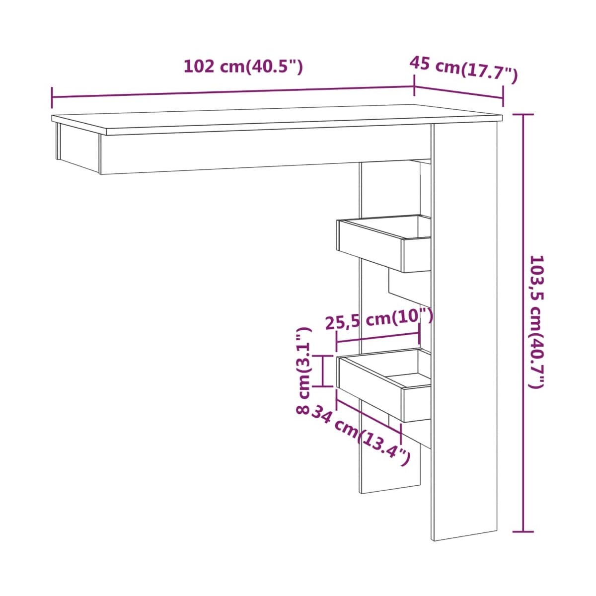 Esta moderna mesa de bar de pared se caracteriza por su estilo sencillo a la par que elegante. Es totalmente apropiada para disfrutar de una copa con tus amigos o familiares. Construcción estable: La construcción de esta mesa de bar garantiza su robustez y durabilidad.Función de almacenamiento: Equipada con 2 compartimentos de almacenamiento, esta mesa de pie proporciona un amplio espacio para que puedas colocar botellas de vino u otros artículos.Material fácil de limpiar: Hecha de madera contrachapada, la mesa de sofá es fácil de limpiar. Advertencia:Para evitar el vuelco, este producto debe usarse con el dispositivo provisto para fijarlo a la pared.