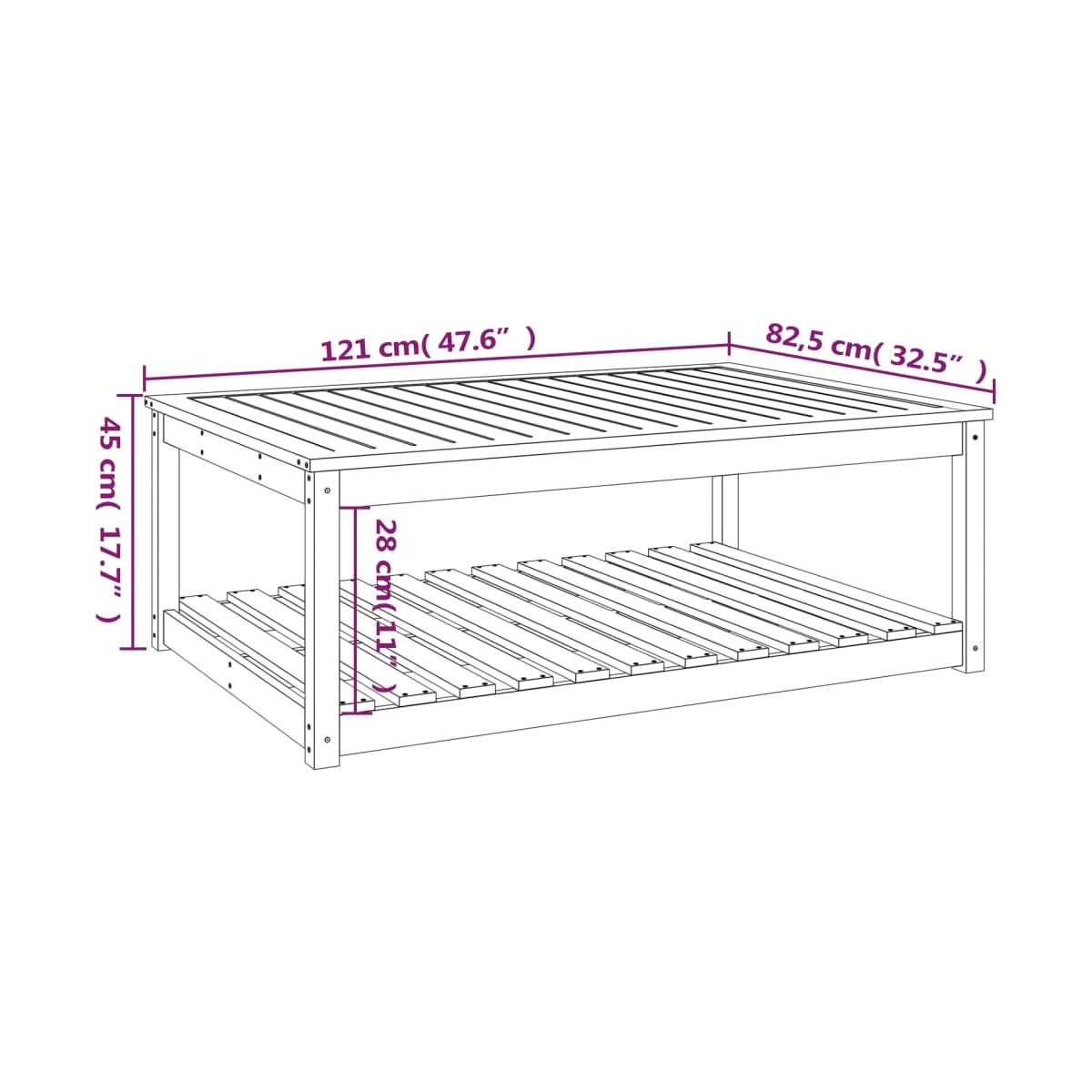 ¡Disfruta de una buena comida con la familia y los amigos alrededor de esta mesa de jardín de madera! Aportará un toque de elegancia al patio, el jardín o la terraza. Madera de pino maciza: La madera de pino maciza es un bonito material natural. La madera de pino tiene vetas rectas, y los nudos dan al material su distintivo aspecto rústico.Superficie estable: La superficie ofrece un soporte excelente para bebidas, aperitivos, fruteros y tus adornos favoritos.Espacio de almacenaje adicional: La mesa para patio está diseñada con un estante abierto que brinda un plus de espacio para mantener tus cosas del día a día bien organizadas y al alcance.Estructura robusta: La estructura de madera garantiza la solidez y estabilidad de la mesa de salón.Amplios usos: La mesa de salón para jardín, con un diseño notable, crea un aspecto general agradable que se integra sin esfuerzo en cualquier entorno. Información útil:Para facilitar al máximo el montaje, cada producto se entrega con un manual.Nota:Para asegurarte de que tus muebles de exterior se mantengan hermosos, recomendamos protegerlos con una funda impermeable.