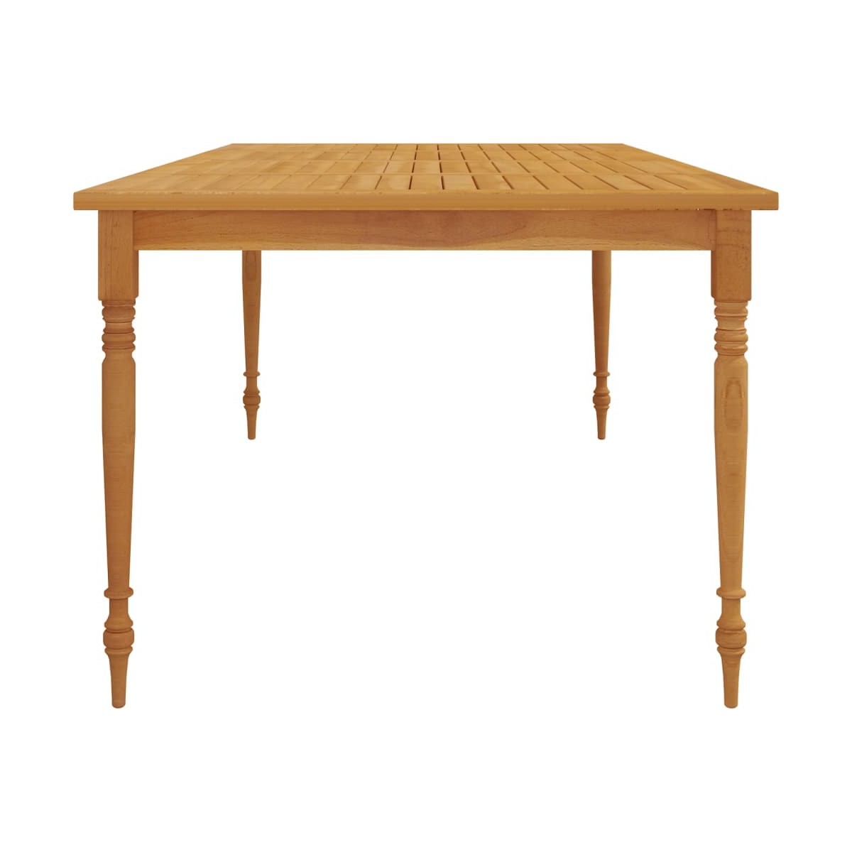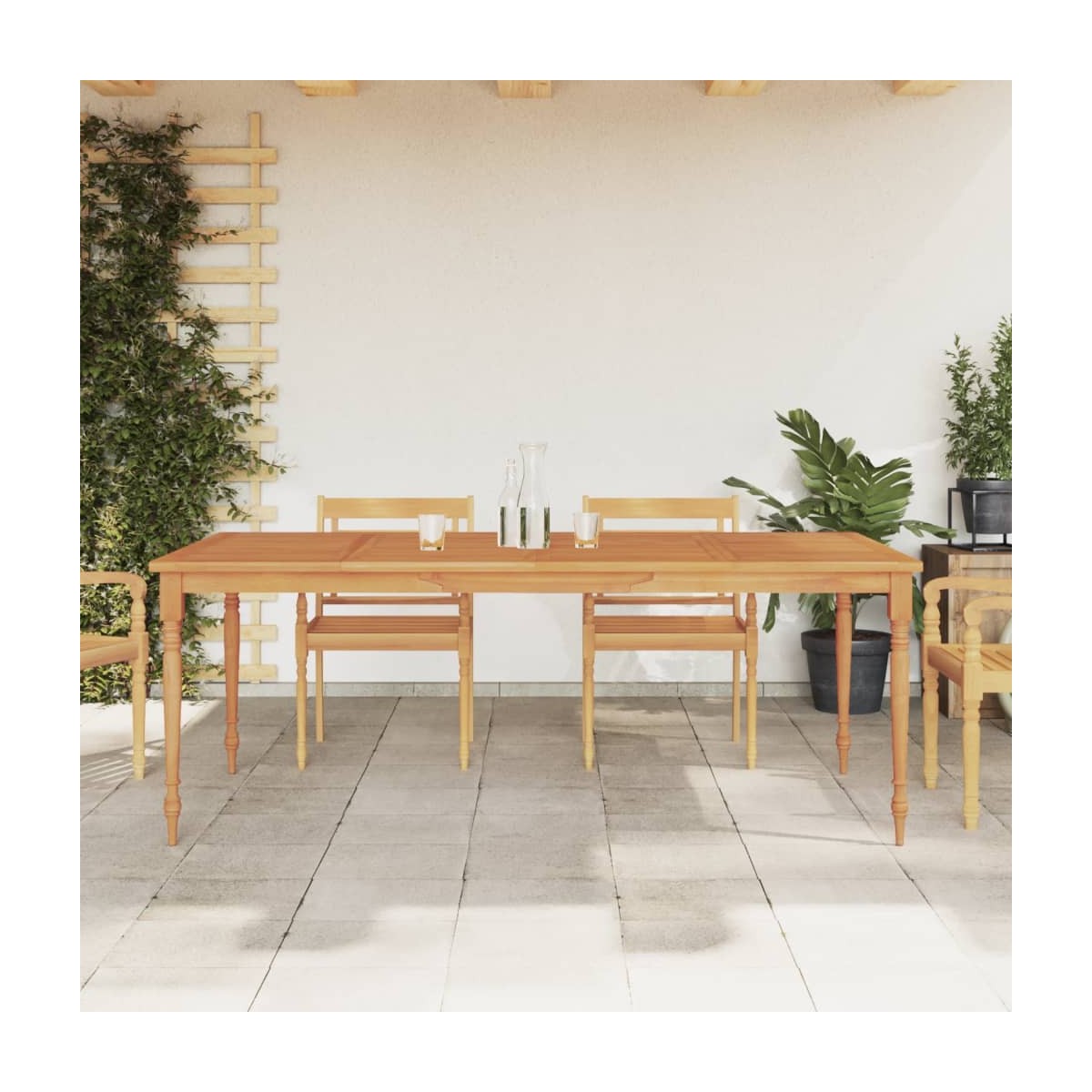 ¡Disfruta cada día de una comida perfecta con la familia o los amigos en esta mesa Batavia de madera! Material duradero: La madera maciza de teca es un hermoso material natural. Ha sido curada, secada al horno y después lijada finamente para darle un aspecto muy suave. La madera de teca es conocida por su excepcional fuerza y resistencia a la intemperie.Estructura robusta: La estructura de madera de esta mesa garantiza su solidez y estabilidad.Superficie estable: La estable superficie de esta mesa de comedor te ofrece espacio para colocar aperitivos, fruteros, adornos y otros artículos esenciales.Elegante diseño: La mesa tallada de forma exquisita dará un toque de encanto rústico al jardín y es muy adecuada para relajarse al aire libre con amigos y familiares. Información útil:Para asegurarte de que tus muebles de exterior se mantengan hermosos, recomendamos protegerlos con una funda impermeable.