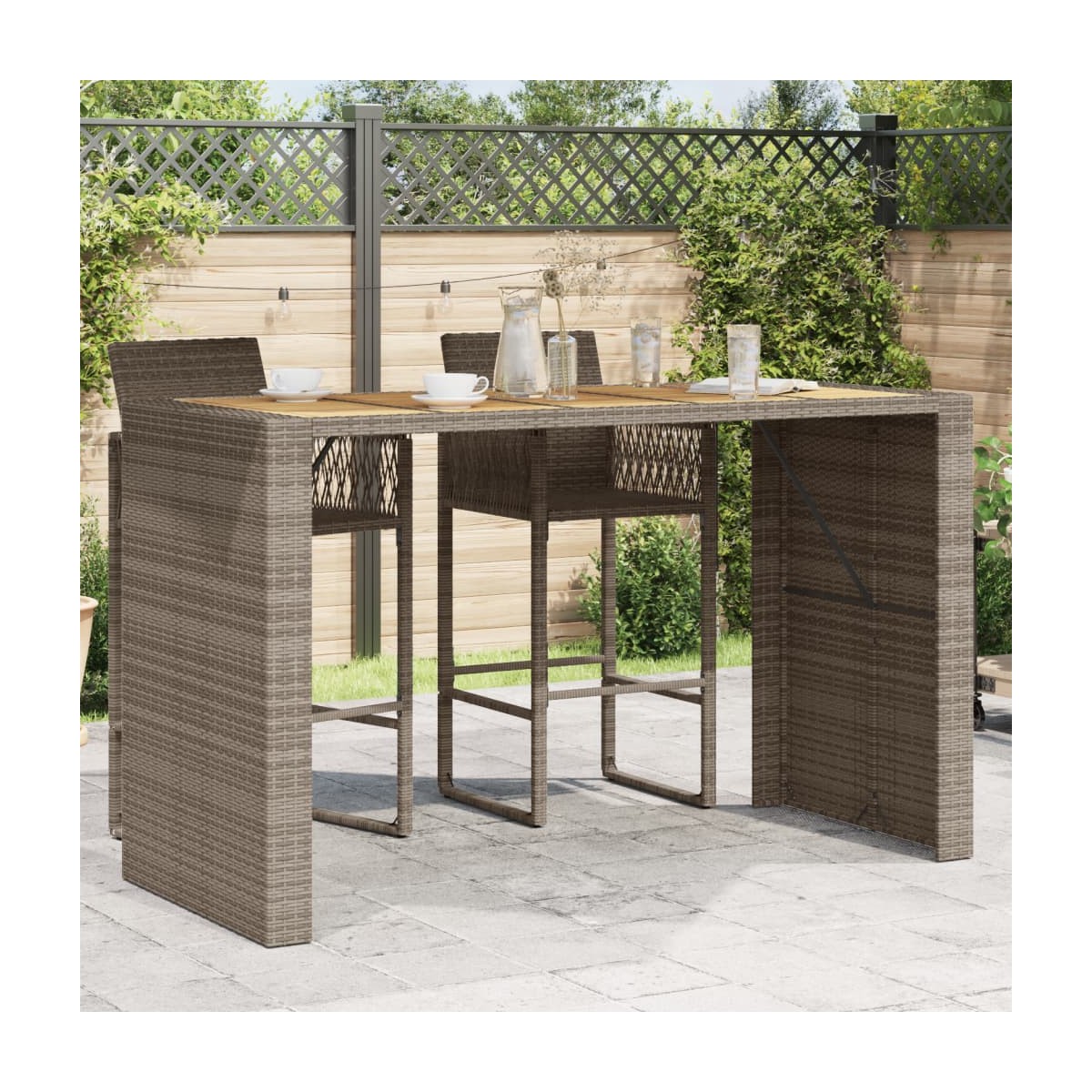 Esta mesa alta de jardín con superficie de madera, diseñada con líneas sencillas y limpias, es una excelente opción para el jardín, el patio y cualquier otro espacio al aire libre. Material duradero: El ratán PE, también conocido como ratán sintético, es un material sintético resistente y de bajo mantenimiento que se parece al ratán natural. Es ligero, fácil de limpiar y se usa comúnmente para muebles de exterior debido a su durabilidad y propiedades resistentes a la intemperie.Superficie estable y fácil de limpiar: Esta mesa de jardín tiene una superficie de madera de acacia que es resistente, duradero y fácil de limpiar con un paño húmedo.Estructura robusta y estable: La estructura de acero con recubrimiento en polvo garantiza que el mueble de jardín sea resistente y estable para usarlo a diario al aire libre. Información útil:Para asegurarte de que tus muebles de exterior se mantengan hermosos, recomendamos protegerlos con una funda impermeable.