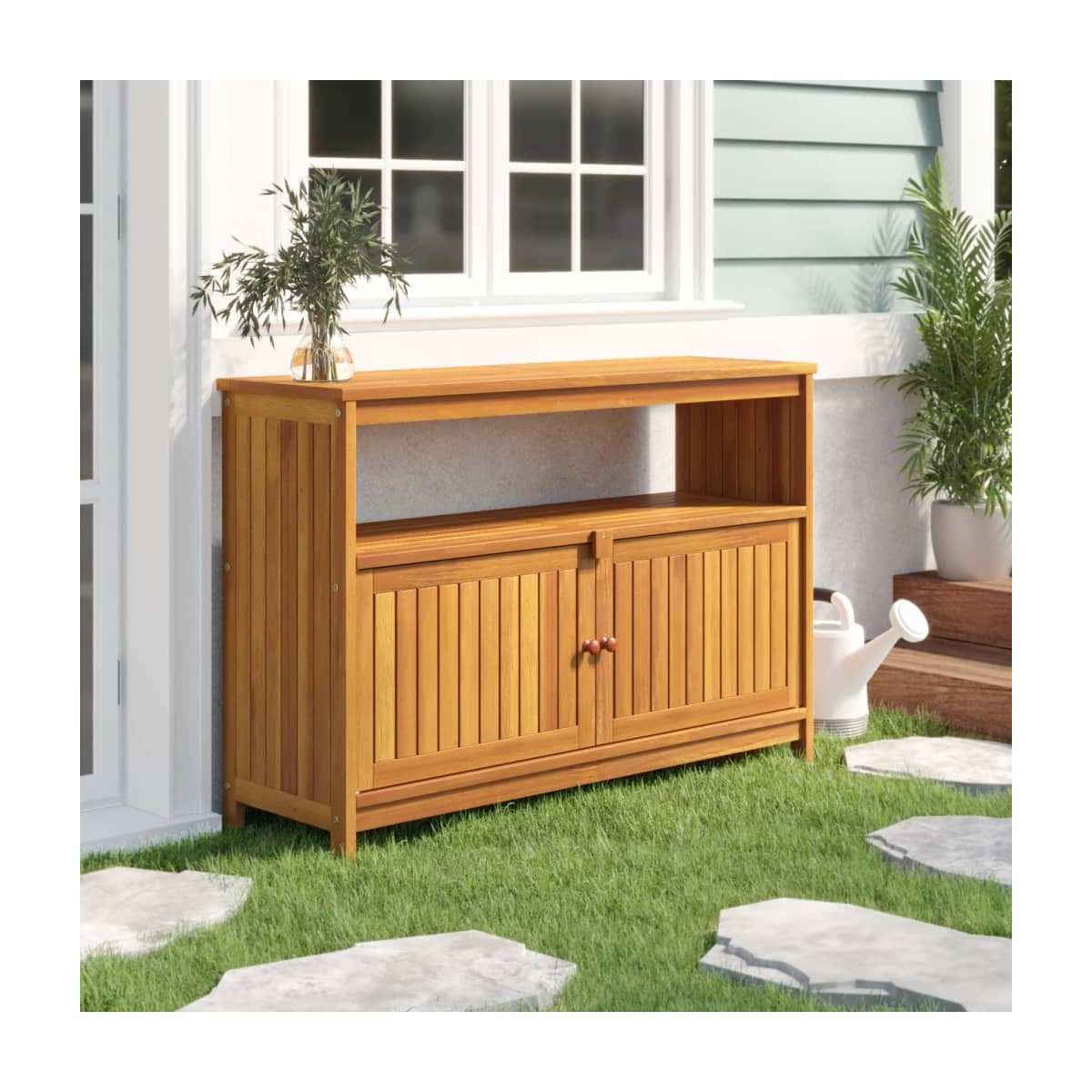 Esta mesa consola de madera para el jardín está diseñada para agregar un estilo rústico único al interior y exterior de la casa. Material duradero: La madera maciza de acacia es un hermoso material natural. La madera de acacia es una madera dura tropical, densa, robusta y duradera.Estructura estable: La estructura de madera de la mesa consola garantiza su solidez y estabilidad.Amplio espacio de almacenaje: La mesa para exteriores tiene 1 estante y 1 compartimento con puertas, lo que brinda suficiente espacio de almacenamiento para que puedas mantener organizadas y al alcance tus cosas del día a día.Prácticas puertas: Mantén tus cosas sin polvo al esconderlas detrás de las puertas de la mesa de jardín. Advertencia:Para evitar que vuelque, este producto debe usarse con el dispositivo de fijación a la pared incluido. Información útil:Para facilitar al máximo el montaje, cada producto se entrega con un manual. Nota:Para asegurarte de que tus muebles de exterior se mantengan hermosos, recomendamos protegerlos con una funda impermeable.