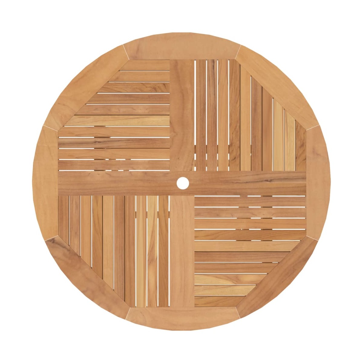 ¡Disfruta de tu tiempo libre con la familia y los amigos alrededor de esta mesa de jardín de madera! Madera de teca maciza: La madera de teca maciza es un hermoso material natural. Ha sido secada al horno y después lijada finamente para darle un aspecto muy suave. La madera de teca es conocida por su excepcional fuerza y resistencia a la intemperie.Diseño plegable: La mesa de exterior se puede plegar para moverla y transportarla fácilmente. Puedes guardarla ocupando menos espacio cuando no la uses.Amplia superficie: La mesa de terraza te ofrece una superficie espaciosa. Podrás colocar aperitivos, bebidas y cualquiera de tus adornos favoritos.Orificio útil: La mesa de comedor tiene un útil orificio en la superficie donde puedes colocar la sombrilla o parasol. Aporta sombra en las reuniones familiares veraniegas o para las cenas con los amigos.Muchos usos: La mesa tiene un diseño atemporal y se adapta a casi cualquier decoración. Puedes colocarla en casa o en cualquier patio comercial, jardín, balcón, etc. Información útil:Para asegurarte de que tus muebles de exterior se mantengan hermosos, recomendamos protegerlos con una funda impermeable.