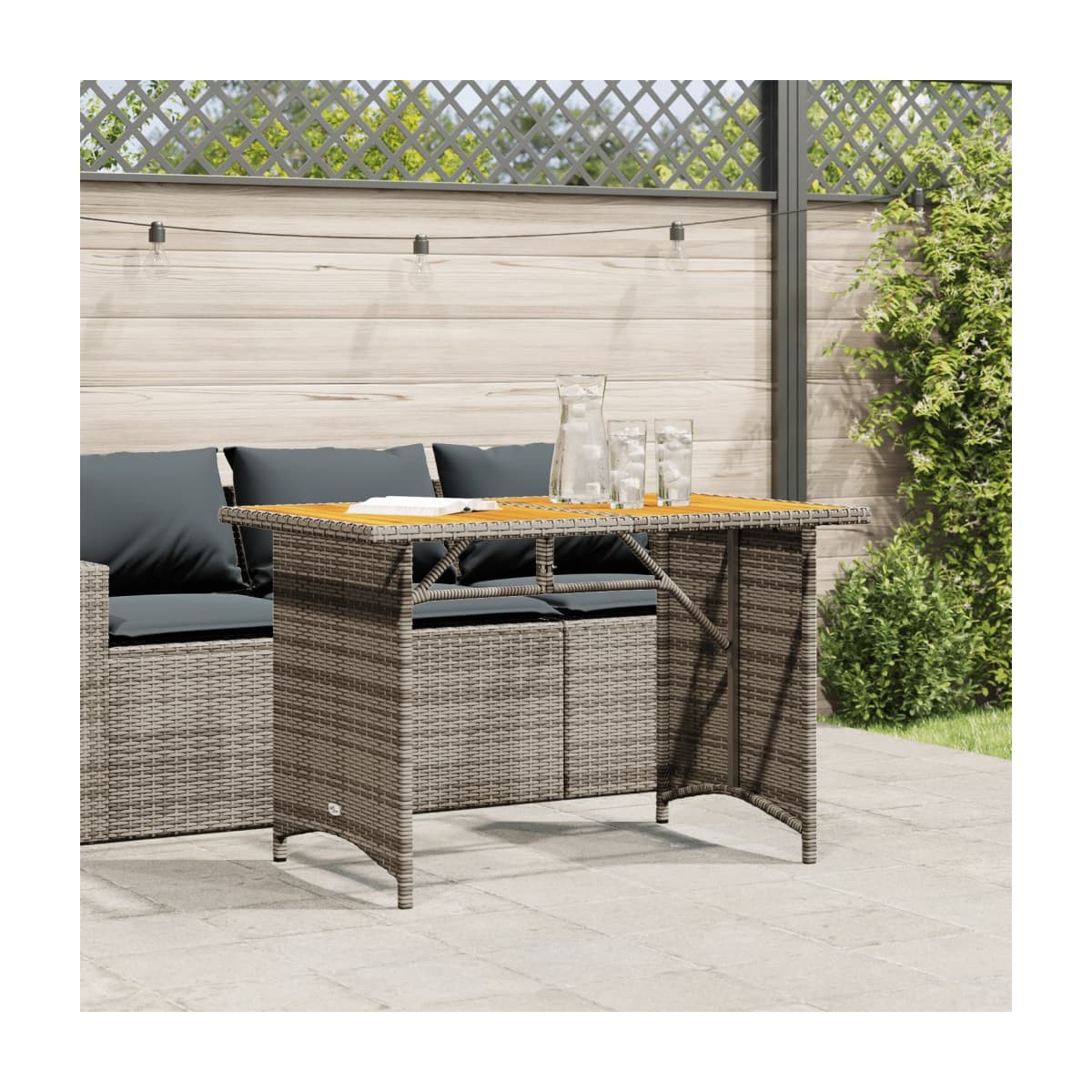 Esta mesa de jardín con superficie de madera, diseñada con líneas sencillas y limpias, es una excelente opción para el jardín, el patio y cualquier otro espacio al aire libre. Material duradero: El ratán PE, también conocido como ratán sintético, es un material sintético resistente y de bajo mantenimiento que se parece al ratán natural. Es ligero, fácil de limpiar y se usa comúnmente para muebles de exterior debido a su durabilidad y propiedades resistentes a la intemperie.Superficie de madera: La superficie de la mesa de exterior es de madera de acacia resistente y duradera, por lo que es fácil de limpiar con un paño húmedo y añade un toque de elegancia a tu espacio exterior.Estructura robusta y estable: La estructura de acero con recubrimiento en polvo garantiza que el mueble de jardín sea resistente y estable para usarlo a diario al aire libre. Información útil:Para asegurarte de que tus muebles de exterior se mantengan hermosos, recomendamos protegerlos con una funda impermeable.