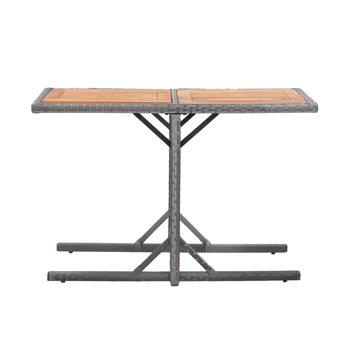 Nuestra mesa de jardín de ratán sintético, que combina estilo y funcionalidad, será una pieza central en tu jardín, patio o terraza. Hecha de ratán PE resistente a la intemperie e impermeable, la mesa es fácil de limpiar, resistente y adecuada para el uso diario. La estructura de acero con recubrimiento en polvo la hace muy robusta y duradera. Gracias a su construcción ligera, es fácil de mover. La superficie está hecha de madera maciza de acacia con un acabado de aceite natural, una superficie tropical, que es muy duradera. La mesa es fácil de montar.