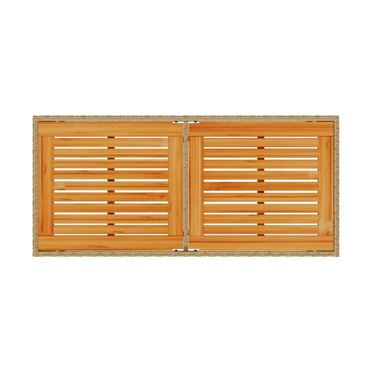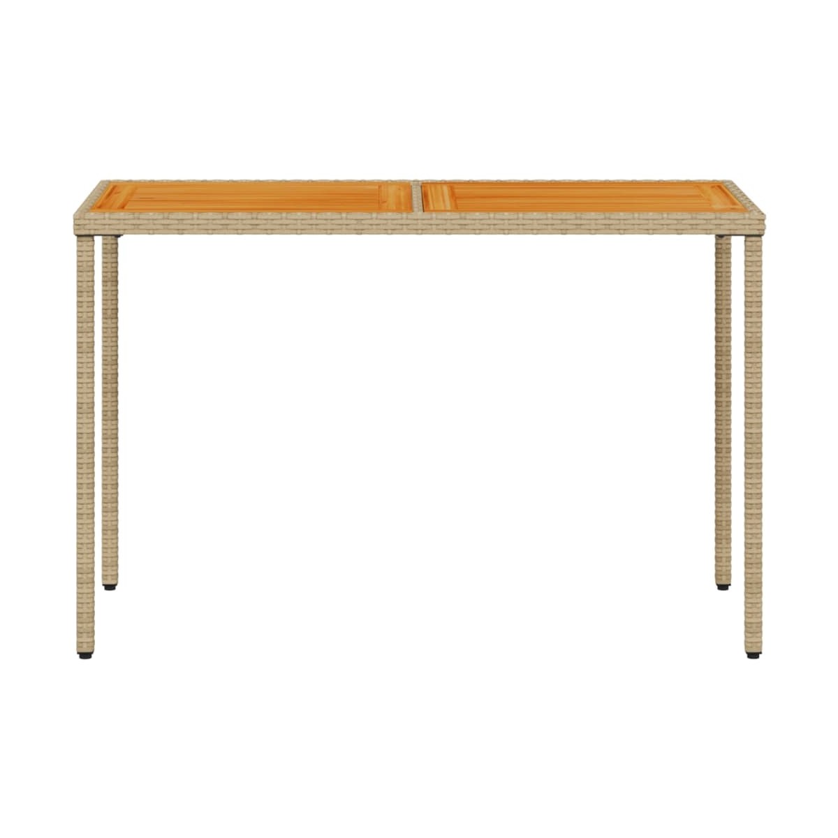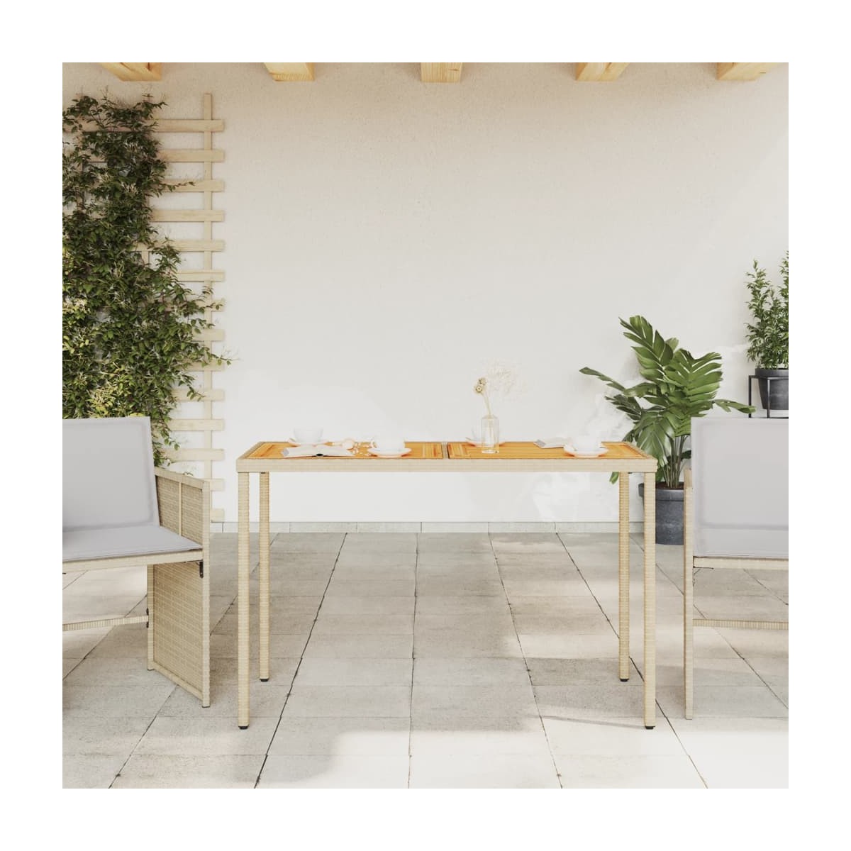 Esta mesa de jardín con superficie de madera, diseñada con líneas sencillas y limpias, es una excelente opción para el jardín, el patio y cualquier otro espacio al aire libre. Material duradero: El ratán PE, también conocido como ratán sintético, es un material sintético resistente y de bajo mantenimiento que se parece al ratán natural. Es ligero, fácil de limpiar y se usa comúnmente para muebles de exterior debido a su durabilidad y propiedades resistentes a la intemperie.Superficie estable y fácil de limpiar: Esta mesa de jardín tiene una superficie de madera de acacia que es resistente, duradero y fácil de limpiar con un paño húmedo.Estructura robusta y estable: La estructura de acero con recubrimiento en polvo garantiza que el mueble de jardín sea resistente y estable para usarlo a diario al aire libre. Información útil:Para asegurarte de que tus muebles de exterior se mantengan hermosos, recomendamos protegerlos con una funda impermeable.