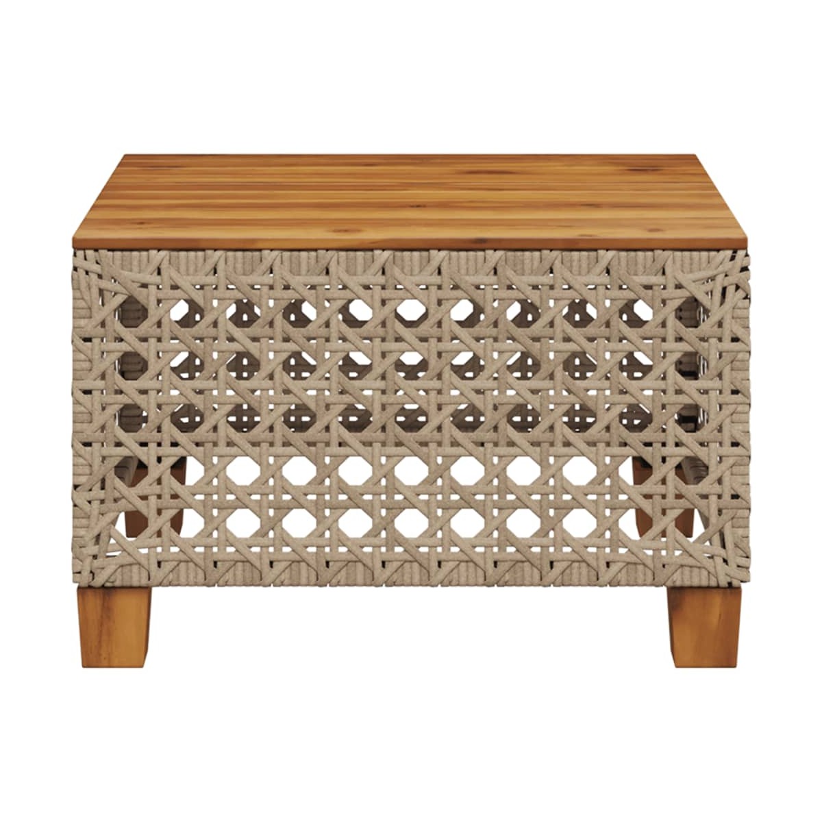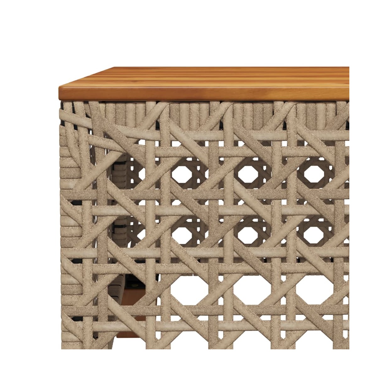 ¡Reúnete alrededor de esta mesa de jardín para disfrutar de una taza de café o charlar con tu familia y amigos en el jardín, el patio o terraza! Material duradero: El ratán PE, también conocido como ratán sintético, es un material sintético resistente y de bajo mantenimiento que se parece al ratán natural. Es ligero, fácil de limpiar y se usa comúnmente para muebles de exterior debido a su durabilidad y propiedades resistentes a la intemperie.Superficie estable y fácil de limpiar: Esta mesa de jardín tiene una superficie de madera de acacia que es resistente, duradero y fácil de limpiar con un paño húmedo.Estructura robusta y estable: La estructura de acero con recubrimiento en polvo garantiza que el mueble de jardín sea resistente y estable para usarlo a diario al aire libre. Información útil:Para asegurarte de que tus muebles de exterior se mantengan hermosos, recomendamos protegerlos con una funda impermeable.