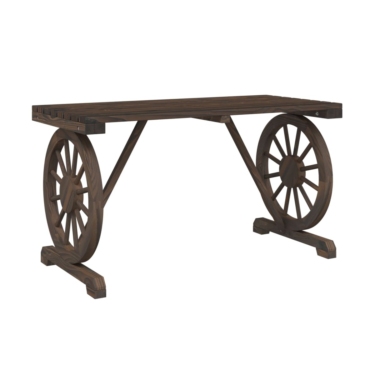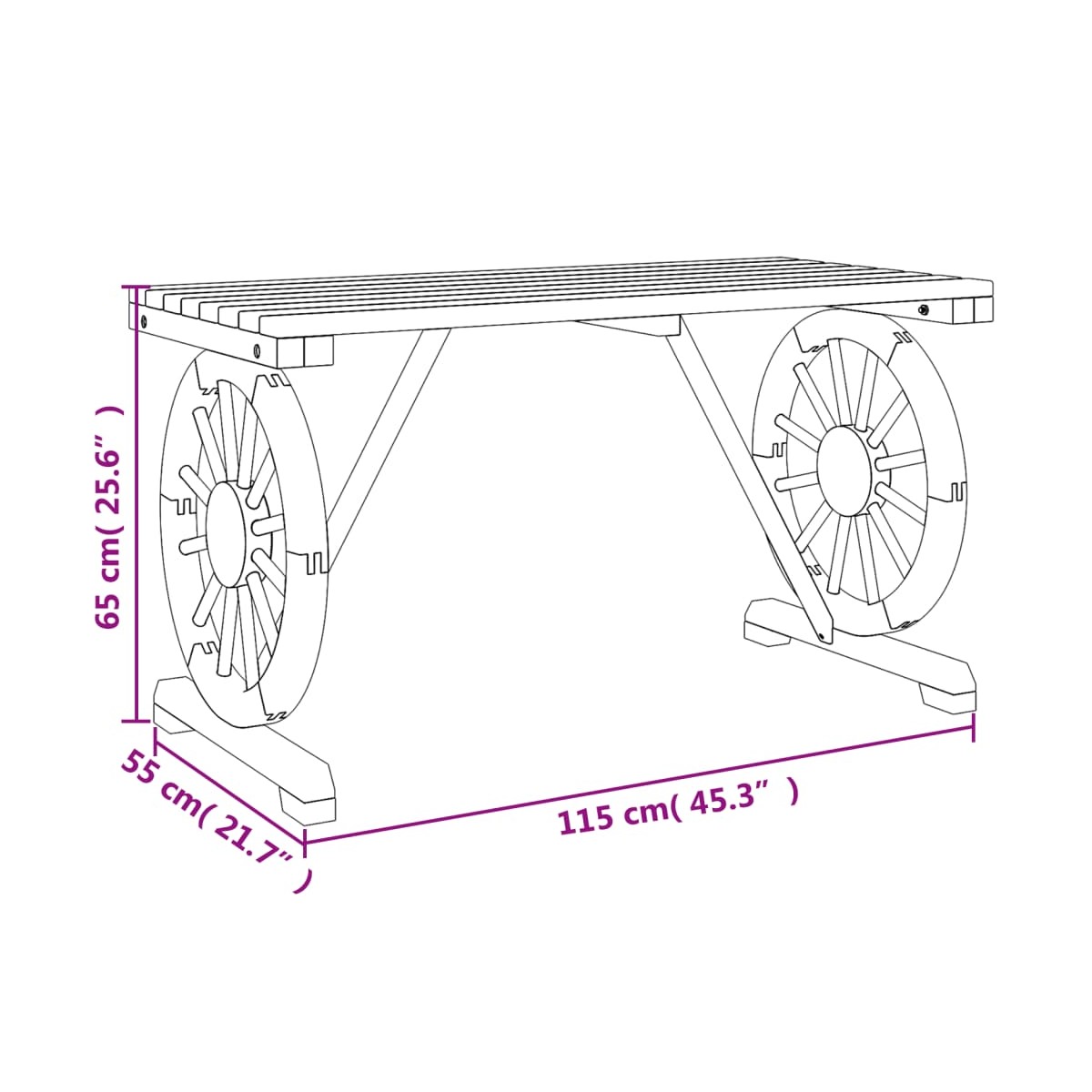 ¡Disfruta de una buena comida al aire libre con tu familia y amigos alrededor de esta mesa de jardín! La mesa de madera aportará un toque de encanto rústico a tu patio, jardín o terraza. Madera maciza de abeto: La madera maciza de abeto es un material bonito y duradero que mantiene su integridad incluso cuando se expone a la humedad. No se seca ni se deforma, lo que la convierte en una opción fiable.Mesa práctica: La mesa de jardín es perfecta para colocar bebidas, comida y artículos decorativos.Diseño atractivo: La mesa de exterior tiene un diseño de rueda de carro que ofrece una imagen llamativa desde todos los ángulos. Información útil:Para asegurarte de que tus muebles de exterior se mantengan hermosos, recomendamos protegerlos con una funda impermeable.