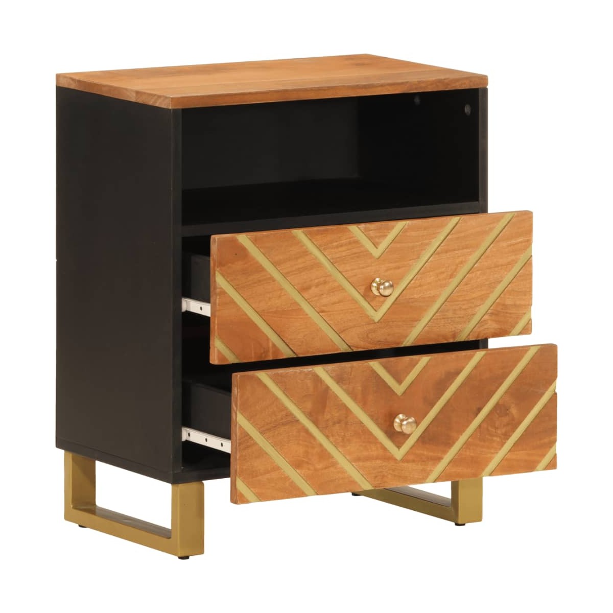 Esta mesita de noche, con un diseño elegante, es un aporte atemporal para la decoración de tu hogar. Madera maciza de mango: La madera maciza de mango es una madera dura, tropical y resistente, que sirve para fabricar muebles robustos. Las bonitas vetas de la madera hacen que cada mueble sea ligeramente diferente al resto. Hecho de madera maciza de mango, el mueble es duradero y estable.Amplio espacio de almacenaje: La mesita de noche está diseñada con 2 cajones y 1 compartimento para guardar las cosas organizadas y al alcance.Superficie estable: La superficie de este mueble auxiliar es perfecta para exponer objetos decorativos, marcos de fotos y plantas.Patas resistentes: Las patas de hierro aumentan la robustez y estabilidad de los muebles del dormitorio. Advertencia:Para evitar que vuelque, este producto debe usarse con el dispositivo de fijación a la pared incluido.
