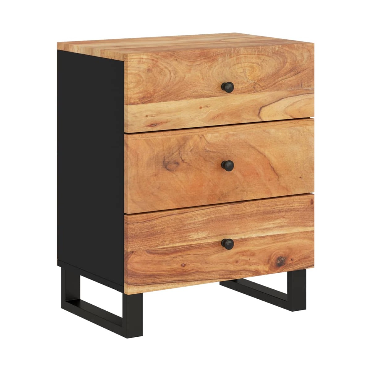 ¡Dale un toque industrial a tu habitación con la mesita de noche! Es un aporte práctico y decorativo para la casa. Material de primera calidad: La madera maciza de acacia es un bonito material natural. La madera de acacia es una madera dura tropical, densa, robusta y duradera.Amplio espacio de almacenamiento: Equipada con 3 cajones, la mesita de noche ofrece un amplio espacio de almacenamiento para mantener varios artículos básicos bien organizados y al alcance de la mano.Superficie resistente: El mueble auxiliar tiene una superficie resistente, perfecta para colocar tazas, libros y otros artículos decorativos.Patas de metal: Las patas metálicas de este mueble de dormitorio garantizan su solidez y estabilidad. Advertencia:Para evitar el vuelco, este producto debe usarse con el dispositivo provisto para fijarlo a la pared. Nota:Cada producto viene con un manual de montaje en la caja para facilitar el montaje.Los colores pueden variar de una pieza a otra, lo que hace que cada pieza sea única y ligeramente diferente de la siguiente. La entrega es aleatoria, asegurando la exclusividad e individualidad del producto.