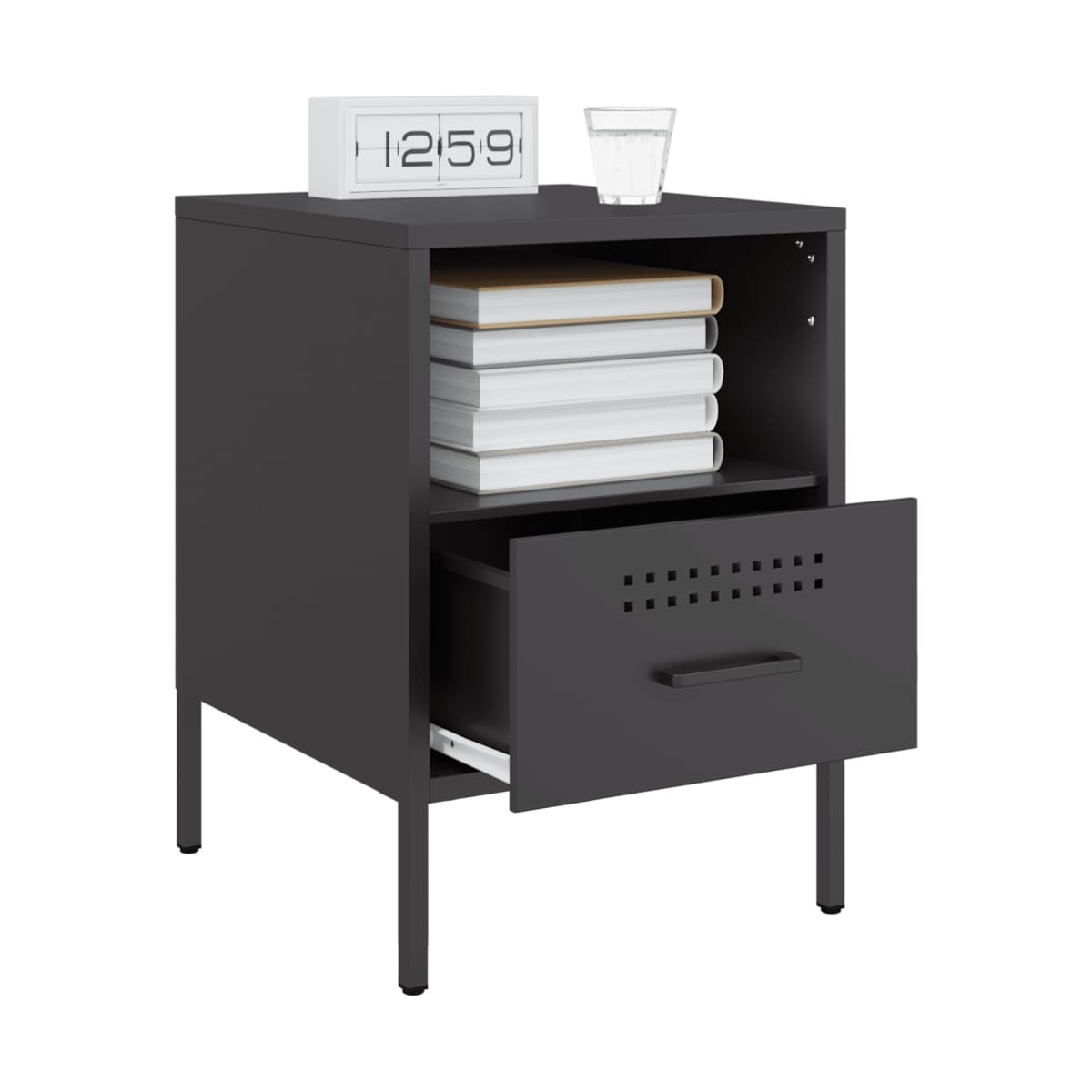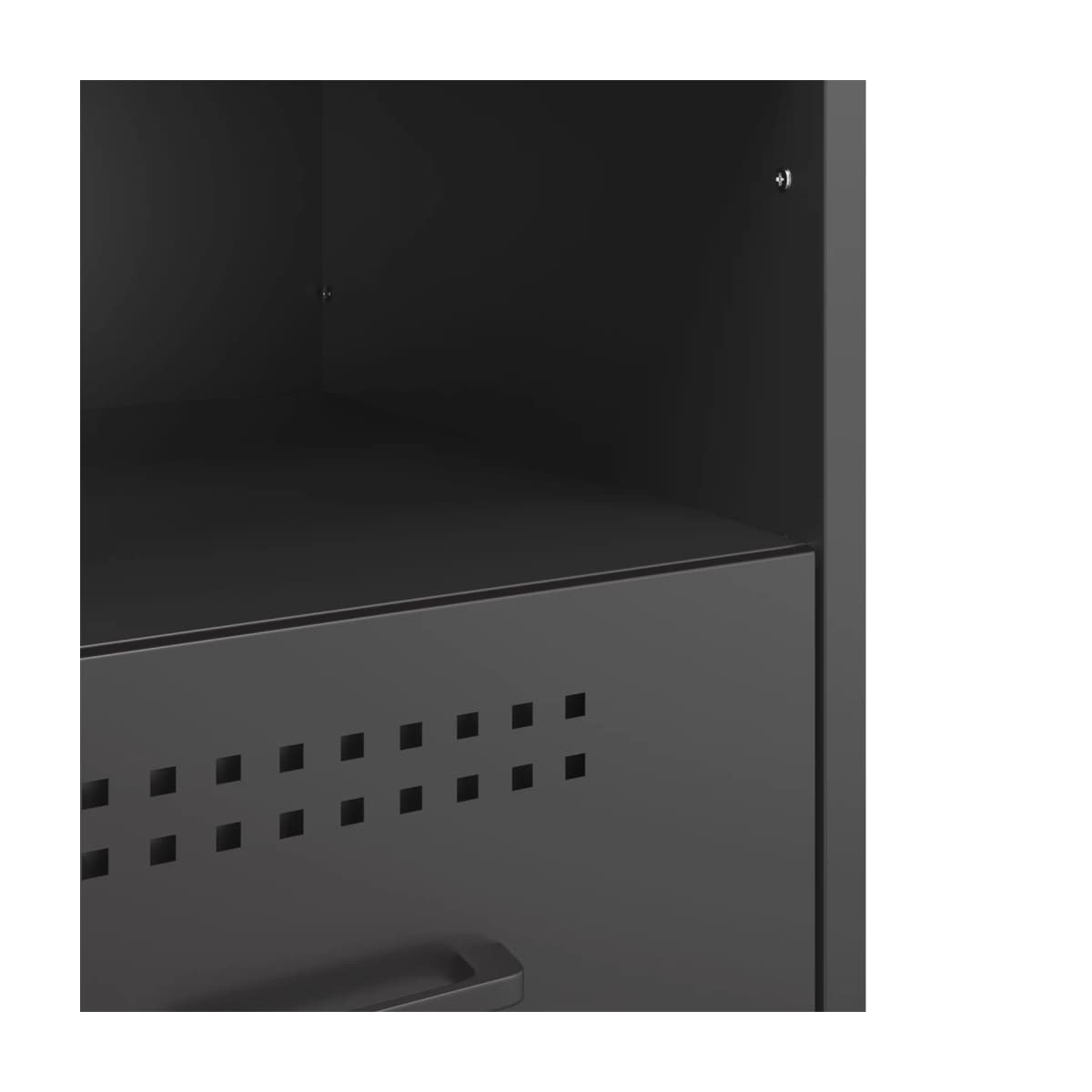 Estas robustas mesitas de noche de estilo industrial son un complemento atemporal para tu salón o dormitorio. Material estable: La estructura del mueble está hecho de acero laminado en frío. El acero laminado en frío es un tipo de acero con bajo contenido de carbono producido por un método de laminado en frío y procesado a temperaturas ambiente cercanas a las normales. El acero laminado en frío tiene una superficie más lisa, mayor resistencia y mayor precisión.Amplio espacio de almacenamiento: Esta mesita de noche ofrece un amplio espacio de almacenamiento para mantener tus revistas, libros, DVDs, mandos a distancia y otros artículos pequeños bien organizados y al alcance.Patas de tornillo ajustables: Esta mesita de noche está equipada con cuatro patas de tornillo ajustables para compensar las irregularidades del suelo, lo que garantiza la estabilidad y el equilibrio.Fácil de limpiar: El armario metálico es fácil de limpiar con un paño húmedo y requiere menos mantenimiento. Advertencia:Para evitar que vuelque, este producto debe usarse con el dispositivo de fijación a la pared suministrado.