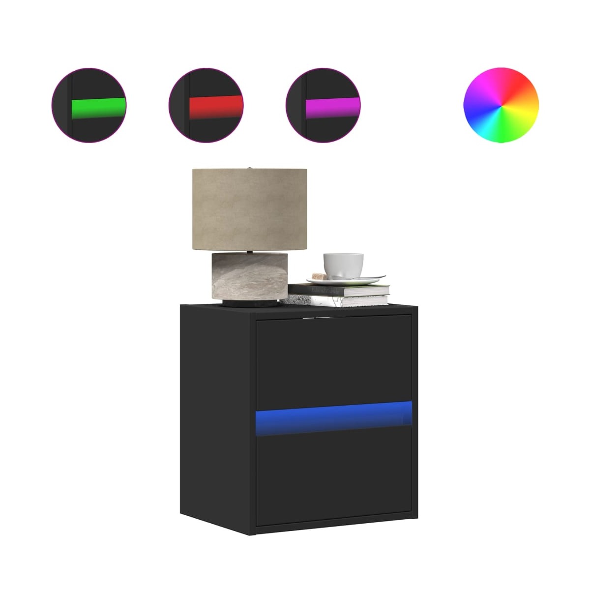 ¡Mejora tu dormitorio con estas mesitas de noche montadas en la pared con luces LED! ¡Complementan fácilmente cualquier estilo de muebles de tu hogar! Material estable y duradero: La madera de ingeniería es un material duradero y estable con una superficie lisa que es resistente a la humedad, la deformación y la rotura, lo que la convierte en una opción fiable para una variedad de proyectos.Luces LED RGB para un ambiente agradable: Esta mesita de noche cuenta con luces LED que se pueden ajustar fácilmente para crear un espectáculo de luces personalizado. Puedes personalizar los modos, los colores y el brillo para mejorar el ambiente de tu hogar.Amplio espacio de almacenamiento: Esta mesita de noche tiene 2 cajones, lo que proporciona un amplio espacio para mantener tus revistas, libros, mandos a distancia y otros artículos pequeños bien organizados y al alcance de la mano.Ahorro de espacio: El diseño de pared aprovecha al máximo el espacio no utilizado de la pared, convirtiéndolo en una zona de almacenamiento compacta y eficiente. Información útil:Los tornillos y los tacos para el interior de la pared no están incluidos. Te recomendamos buscar y utilizar tornillos y tacos adecuados específicamente para tus paredes. Si no estás seguro, puedes consultar con un profesional. Lee y sigue cada paso de las instrucciones.El producto tiene un conector USB que necesita una fuente de alimentación USB certificada de 5 V (no incluida).