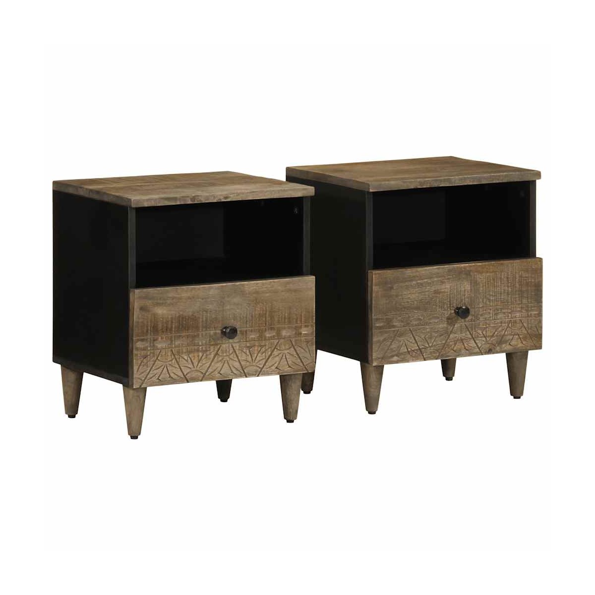 Estas mesitas de noche, con un diseño elegante, son un aporte atemporal para la decoración de tu hogar. Material robusto y estable: La madera maciza de mango, una madera dura tropical robusta, es muy apreciada para la fabricación de muebles por su excepcional durabilidad y resistencia. Las bonitas vetas de la madera hacen que cada mueble sea ligeramente diferente al resto.Amplio espacio de almacenamiento: la mesita de noche ofrece un amplio espacio de almacenamiento para revistas, libros, vasos y otros elementos esenciales para la hora de dormir, manteniéndolos organizados y al alcance.Uso versátil: Esta mesita de noche no es solo para el dormitorio, también se puede utilizar como mesa auxiliar en la sala de estar o espacio de almacenamiento adicional en cualquier habitación, adaptándose perfectamente a sus necesidades.Patas de madera: Esta cama está sostenida por robustas patas, que garantizan estabilidad, seguridad y firmeza. Información útil:Cada artículo es único, con variaciones de color y veta. La entrega es aleatoria garantizando la exclusividad y la individualidad del producto.