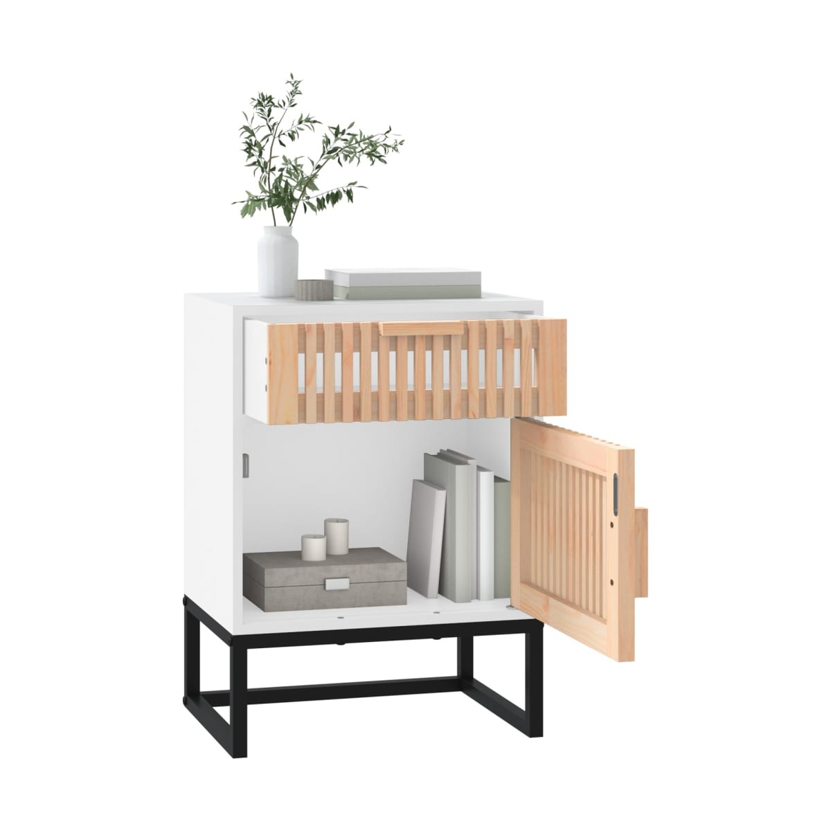 Estas mesitas de noche con un diseño escandinavo son un aporte práctico y decorativo para la decoración interior de la casa. Material duradero: La madera contrachapada tiene una calidad excepcional, con una superficie lisa y también cuenta con fuerza, estabilidad y resistencia a la humedad.Amplio espacio de almacenamiento: Equipada con 1 cajón y 1 compartimento detrás de la puerta, la mesilla de noche ofrece un amplio espacio de almacenaje para mantener diversos objetos del día a día bien organizados y al alcance.Superficie resistente: El mueble auxiliar tiene una superficie resistente, perfecta para colocar tazas, libros y artículos decorativos.Patas de metal: Las patas metálicas de la mesilla de noche garantizan su resistencia y estabilidad. Advertencia:Para evitar que vuelque, este producto debe usarse con el dispositivo de fijación a la pared incluido. Información útil:Para facilitar al máximo el montaje, cada producto se entrega con un manual.