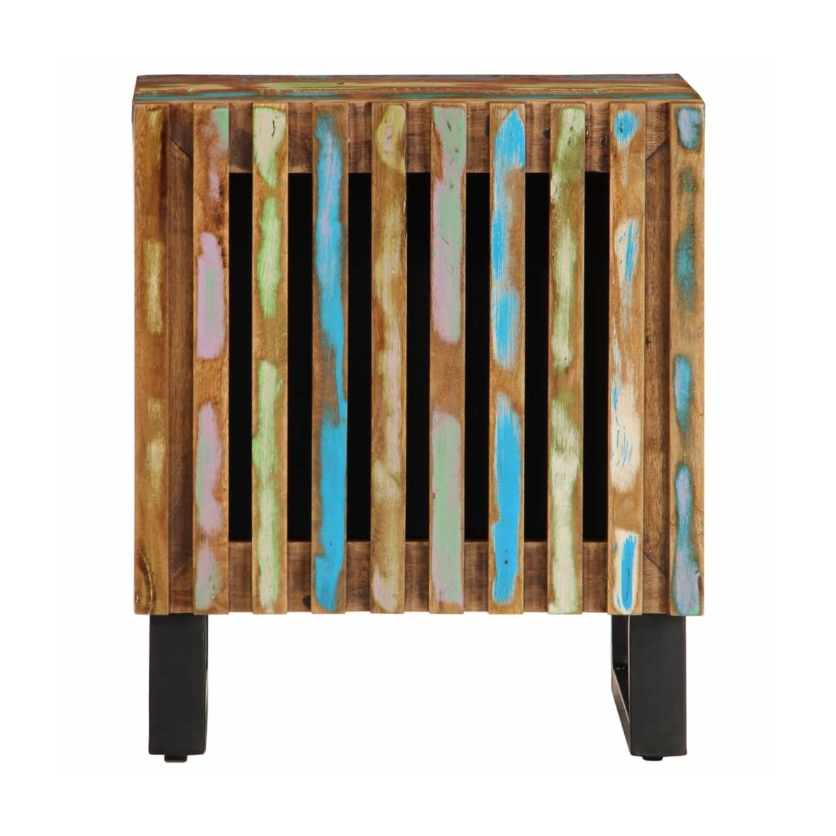Estas mesitas de noche de madera de estilo industrial serán un complemento decorativo y práctico para tu decoración. Madera maciza reciclada: La madera maciza reciclada consta de distintas maderas reutilizadas como la teca, la madera de mango, de pino y de haya. Dichos materiales proceden de antiguas construcciones como fábricas, cobertizos y barcos. Como cada pieza está hecha a mano, los colores variarán en cada producto.Amplio espacio de almacenamiento: La mesita de noche cuenta con un compartimento y proporciona un amplio espacio de almacenamiento para que puedas almacenar y exhibir tus libros, revistas y artículos decorativos, a la vez que mejora tu hogar.Patas estables y duraderas: Este armario está sostenido por patas resistentes, lo que garantiza estabilidad, seguridad y firmeza. Información útil:Cada artículo es único, con variaciones de color y veta. La entrega es aleatoria garantizando la exclusividad y la individualidad del producto.