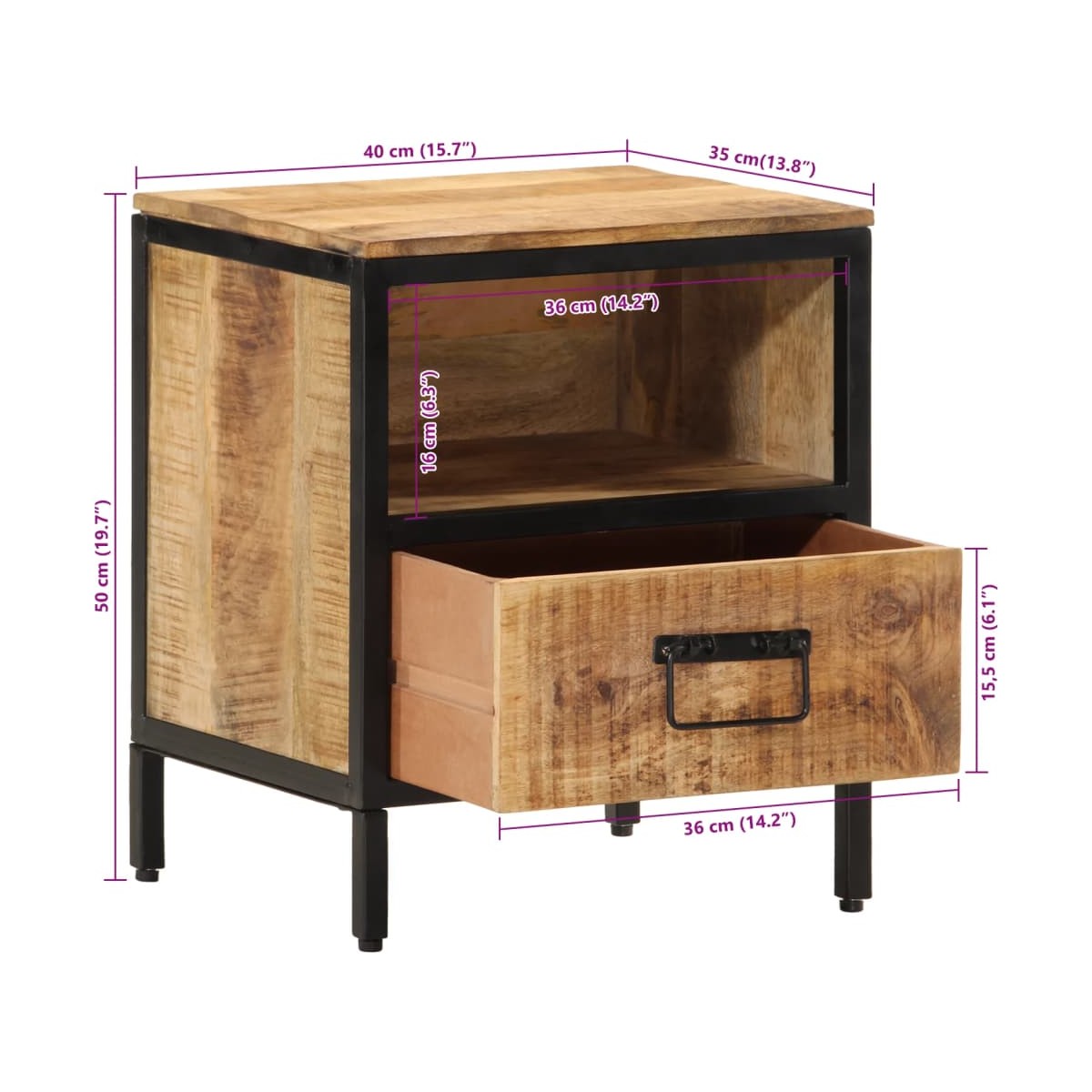 Con un diseño elegante, esta mesita de noche se integrará fácilmente en tu dormitorio o salón, aportando un encanto atemporal a tu decoración. Material duradero: La madera maciza de mango es una madera dura tropical fuerte que hace muebles resistentes. Sus bonitas vetas de madera hacen que cada mueble sea ligeramente diferente del siguiente. Fabricada en madera maciza de mango, esta mesita de noche es robusta y estable.Estructura de hierro: La estructura de hierro añade un estilo tranquilo a tu hogar además de garantizar la estabilidad.Amplio espacio de almacenaje: Este mueble ofrece un práctico espacio de almacenaje para mantener revistas, libros, mandos a distancia y otros objetos pequeños bien organizados y al alcance.Diversidad de usos: La extensión de 1 cm en la parte superior brinda espacio adicional para organizar diversos objetos, como teléfonos móviles, libros y lámparas, etc. Información útil:Cada artículo es único, con variaciones de color y veta. La entrega es aleatoria garantizando la exclusividad y la individualidad del producto.