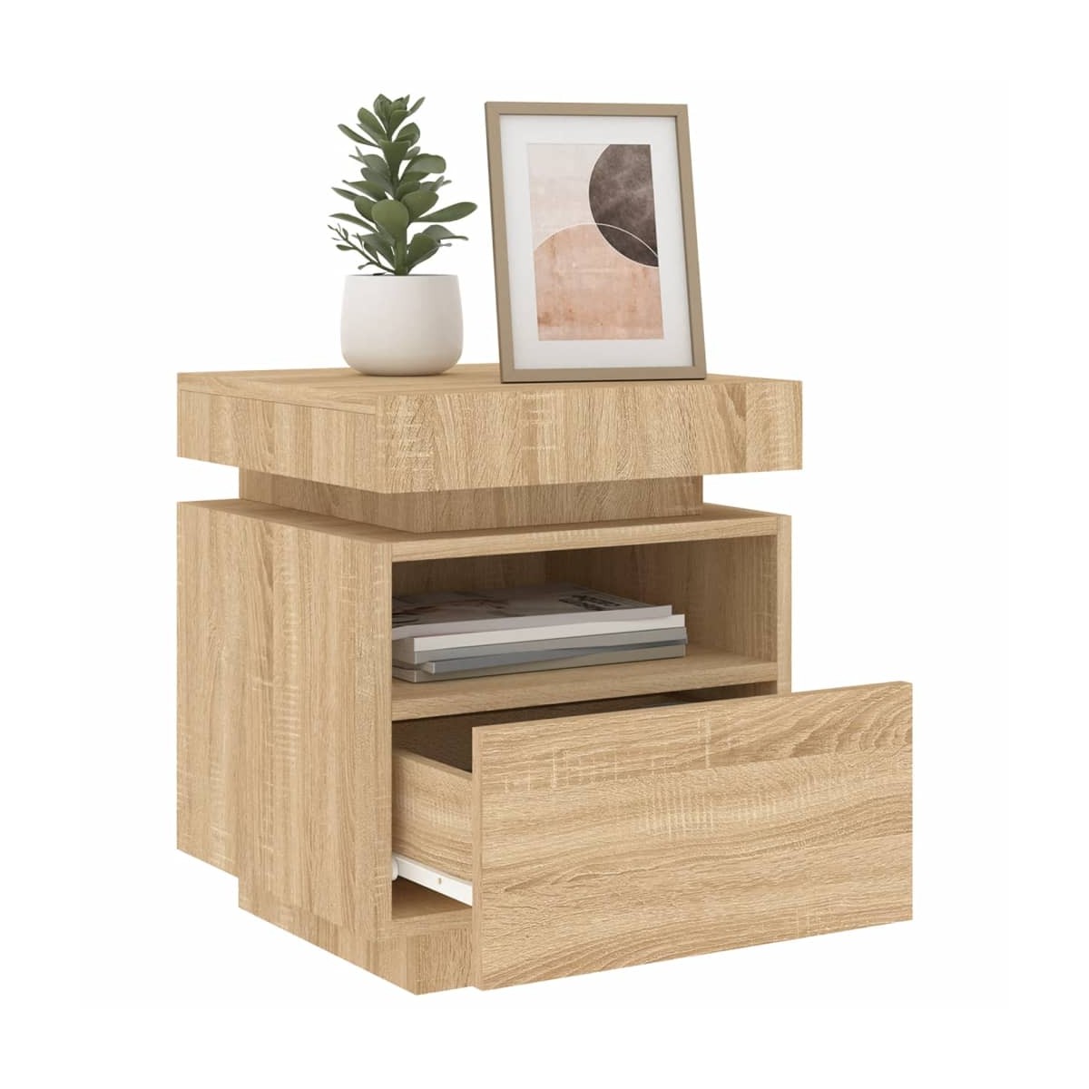 Con un diseño moderno y práctico, este mueble para la TV con luces LED definitivamente se conviertirá en el centro de atención de tu habitación. Material duradero: La madera de ingeniería tiene una calidad excepcional, con una superficie lisa y también cuenta con fuerza, estabilidad y resistencia a la humedad.Luces LED RGB: Estas mesitas de noche cuentan con luces LED RGB, que tienen diferentes menús para cambiar el color de las luces y permitir que el color se ajuste de forma automática.Amplio espacio de almacenaje: Estas mesitas de noche ofrecen un práctico espacio de almacenaje para guardar bien organizados y al alcance revistas, mandos a distancia y otros objetos pequeños.Función de exhibición: Las resistentes partes superiores de estos muebles multimedia son ideales para exhibir objetos decorativos, marcos de fotos o plantas en macetas. Información útil:El producto tiene un conector USB, pero no se incluye la fuente de alimentación USB de 5 V certificada.