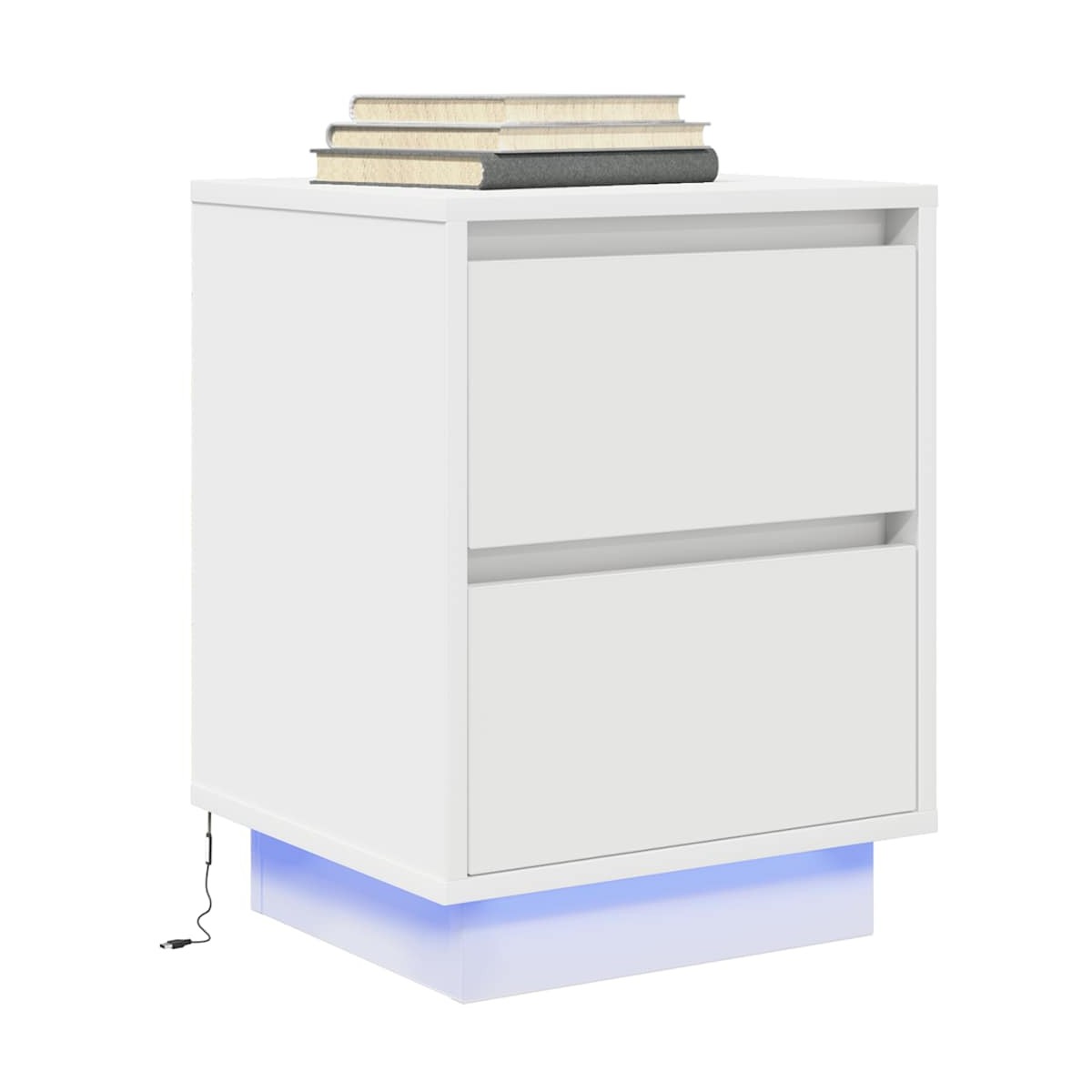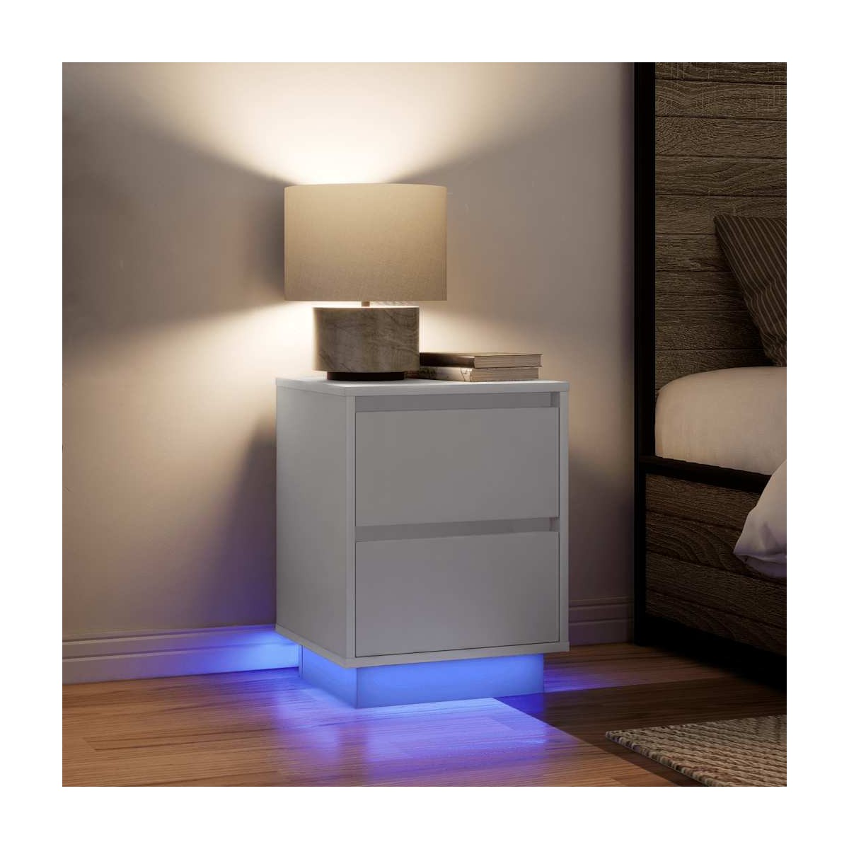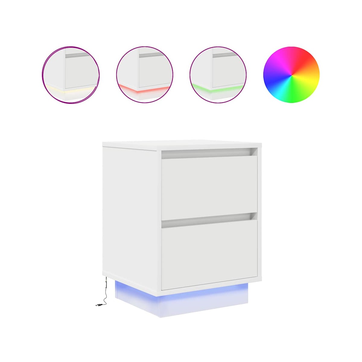 ¡Mejora tu dormitorio con estas mesitas de noche con luces LED! ¡Se complementan fácilmente con cualquier estilo de mobiliario de tu hogar! Material estable y duradero: La madera de ingeniería es un material duradero y estable con una superficie lisa que es resistente a la humedad, la deformación y la rotura, lo que la convierte en una opción fiable para una variedad de proyectos.Luces LED RGB para un ambiente agradable: las luces LED se pueden ajustar fácilmente para crear un espectáculo de luces personalizado. Puedes personalizar los modos, los colores y el brillo para mejorar el ambiente de tu espacio interior.Amplio espacio de almacenamiento: La mesilla de noche ofrece un amplio espacio de almacenamiento para revistas, libros, gafas y otros objetos esenciales para la hora de dormir, manteniéndolos organizados y al alcance de la mano.Superficie resistente: La robusta parte superior de la mesilla de noche es perfecta para colocar lámparas de mesa, despertadores, libros, marcos de fotos, pequeñas plantas en macetas, adornos u otros objetos esenciales.Fácil de mantener: Gracias a su superficie lisa, la mesita de noche es fácil de limpiar con un paño húmedo y requiere menos mantenimiento. Advertencia:Para evitar que vuelque, este producto debe usarse con el dispositivo de fijación a la pared suministrado. Información útil:El producto tiene un conector USB que necesita una fuente de alimentación USB certificada de 5 V (no incluida).