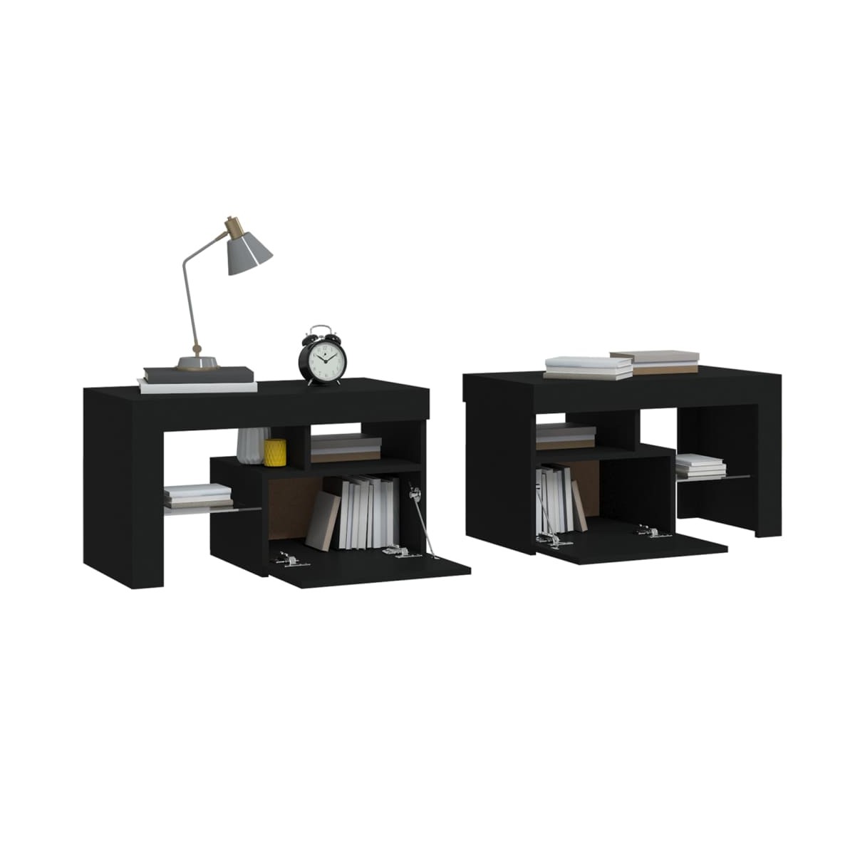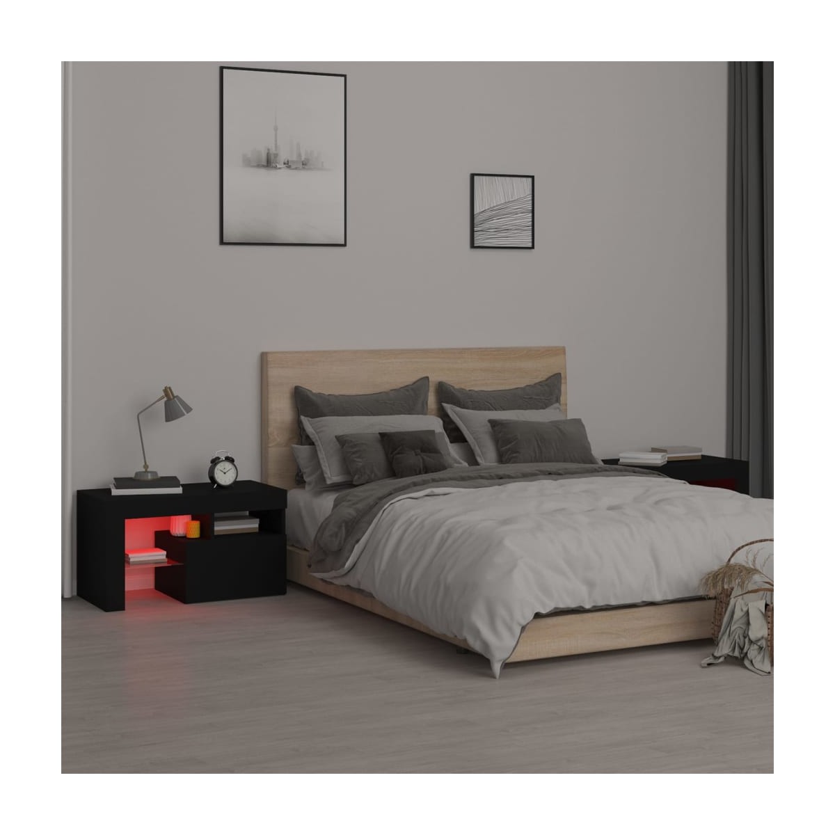 ¡Dale a tu hogar un encanto moderno con estas elegantes mesitas de noche! Con un diseño a la moda y práctico, estas mesitas de noche con luces LED definitivamente se convertirán en el centro de atención de lEDa estancia. Material duradero: La madera contrachapada tiene una calidad excepcional, con una superficie lisa y también cuenta con fuerza, estabilidad y resistencia a la humedad. Luces LED de colores: El mueble cuenta con luces LED RGB, que tienen diferentes menús para cambiar el color de las luces y permitir que el color se ajuste automáticamente de manera diferente. Las luces LED subrayan el aspecto moderno y refuerzan el estilo a la última.Amplio espacio de almacenamiento: La mesita de noche ofrece un montón de espacio de almacenaje para guardar bien organizados y al alcance de la mano revistas, libros, mandos a distancia y otros objetos pequeños.Función de visualización: La robusta superficie del mueble auxiliar es ideal para exhibir objetos decorativos, marcos de fotos o plantas en macetas. Nota:El producto tiene un conector USB, pero no se incluye la fuente de alimentación USB de 5 V certificada.Cada producto viene con un manual de montaje en la caja para facilitar el montaje.