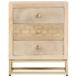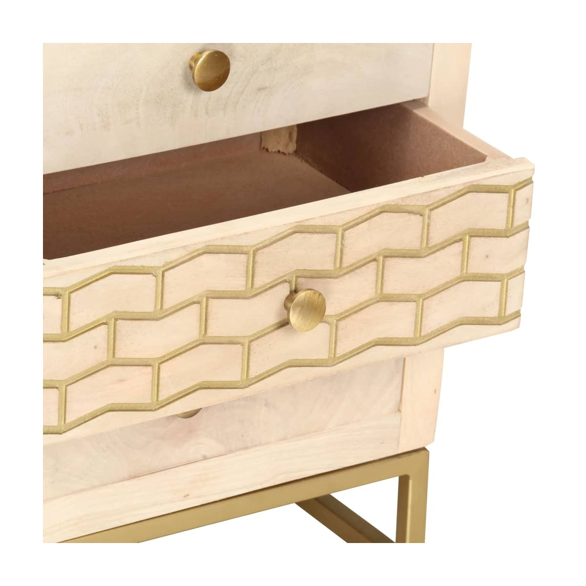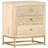 Nuestra mesita de noche de madera tiene un acabado dorado y será un aporte decorativo para tu dormitorio. La mesita de noche está hecha a mano con madera de mango, que es maciza, estable, duradera y bonita. La artesanía aporta un espectacular estilo retro y cada paso del proceso se lleva a cabo con el mayor cuidado, tanto el pulido como la pintura o el lacado. La artesanía y las bonitas vetas de la madera hacen que cada mueble sea único y ligeramente diferente al resto. Además, posee una superficie robusta y tres cajones que proporcionan espacio suficiente para que guardes diversos objetos como libros, vasos, mandos a distancia, etc., para tenerlos organizados y al alcance. Nota importante: Los colores pueden variar de una pieza a otra, por lo que cada pieza es única y ligeramente diferente al resto. La entrega es aleatoria, lo que garantiza la exclusividad e individualidad del producto.