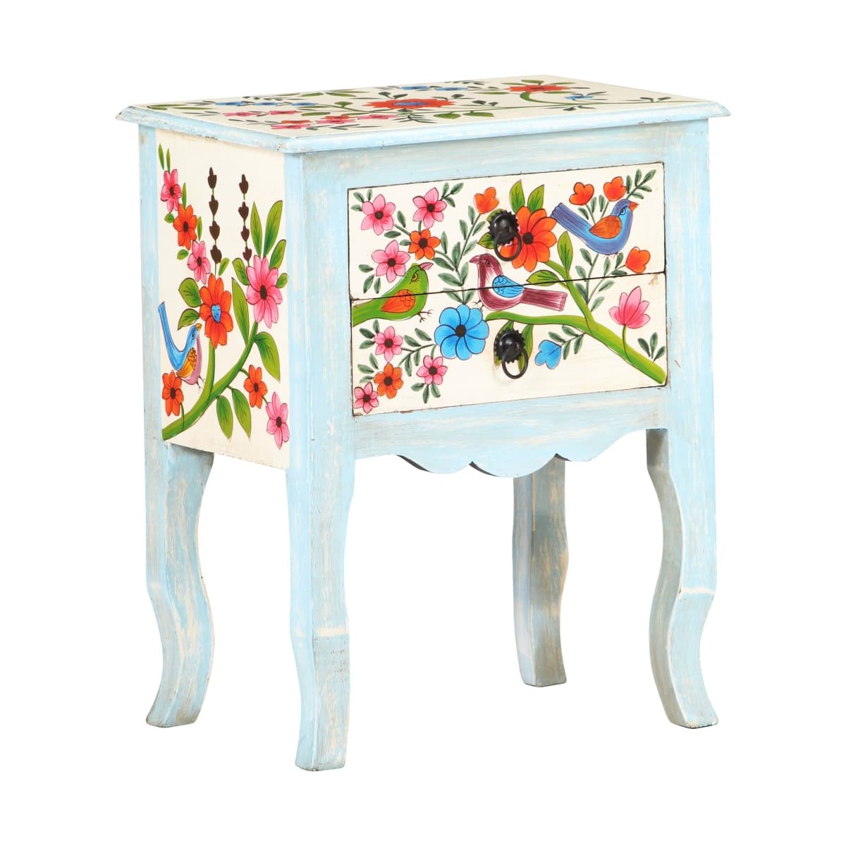 Esta hermosa y única mesita de noche de madera, adornada con ricos adornos pintados a mano, será un llamativo aporte para tu dormitorio con su colorido diseño. La mesita de noche cuenta con amplios detalles decorativos pintados a mano, que crean un efecto cálido y alegre. Este armario auxiliar tiene una superficie robusta para colocar una lámpara de noche, despertador o cualquier otra cosa que puedas necesitar cerca de tu cama. Los dos cajones proporcionan un amplio espacio para mantener todo tipo de artículos pequeños organizados y al alcance. La mesita de noche está hecha de madera de mango maciza, una madera dura tropical. Tiene fuerza para soportar peso y también es resistnte al desgaste del tiempo. Además, la exquisita artesanía hace que cada pieza sea ligeramente diferente de la siguiente. Nota importante: Los colores varían de una pieza a otra, por lo que cada una es única; la entrega es aleatoria.
