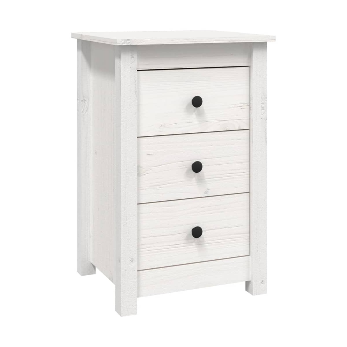 Esta mesita de noche de madera con un diseño elegante es un complemento intemporal para la decoración de tu hogar. Madera de pino maciza: La madera de pino maciza es un bonito material natural. La madera de pino tiene vetas rectas, y los nudos dan al material su distintivo aspecto rústico.Amplio espacio de almacenamiento: Equipada con 3 cajones, esta mesita de noche ofrece un práctico espacio de almacenamiento para guardar bien organizados y al alcance de la mano revistas, mandos a distancia y otros objetos pequeños.Superficie robusta: La mesita de noche cuenta con una robusta superficie que puede ser utilizada para colocar lámparas de mesa, libros, etc. Advertencia:Para evitar el vuelco, este producto debe usarse con el dispositivo provisto para fijarlo a la pared.